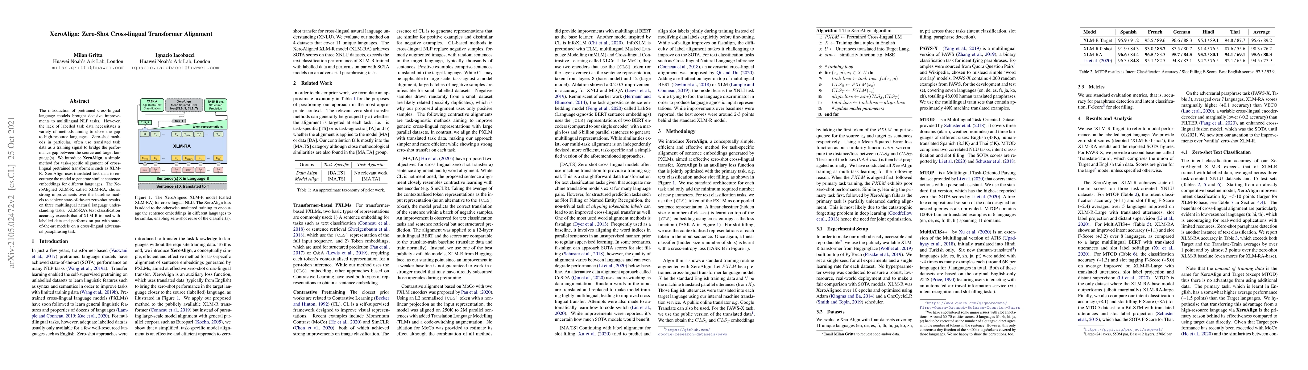 XeroAlign introduces a method for zero-shot alignment of cross-lingual transformers using translated task data, achieving state-of-the-art zero-shot results on multiple multilingual NLP tasks. The aligned model, XLM-RA, outperforms baseline models and matches top-performing models on text classification and cross-lingual paraphrasing tasks.
