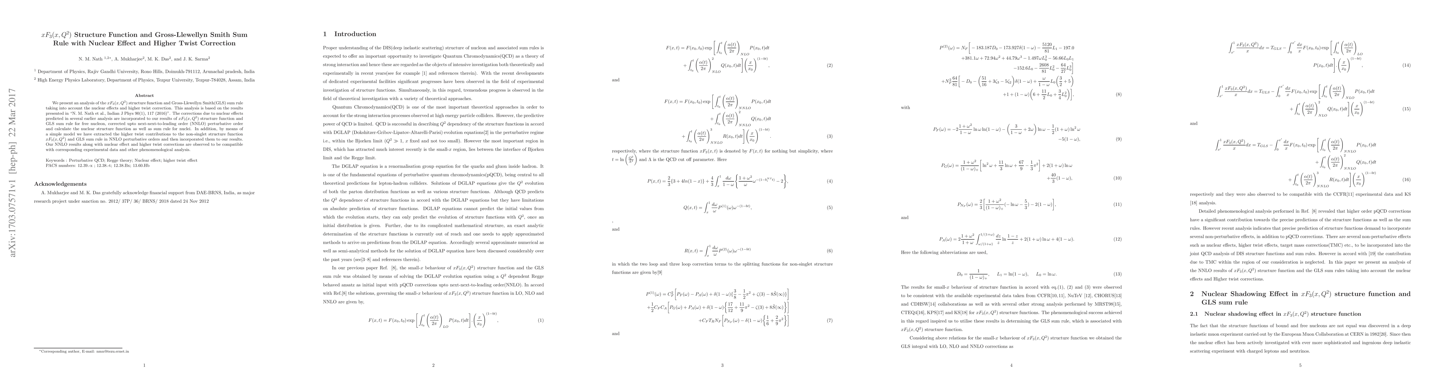 This paper analyzes the $xF_3(x,Q^2)$ structure function and Gross-Llewellyn Smith sum rule, incorporating nuclear effects and higher twist corrections up to next-next-to-leading order (NNLO). The results are consistent with experimental data and other analyses.