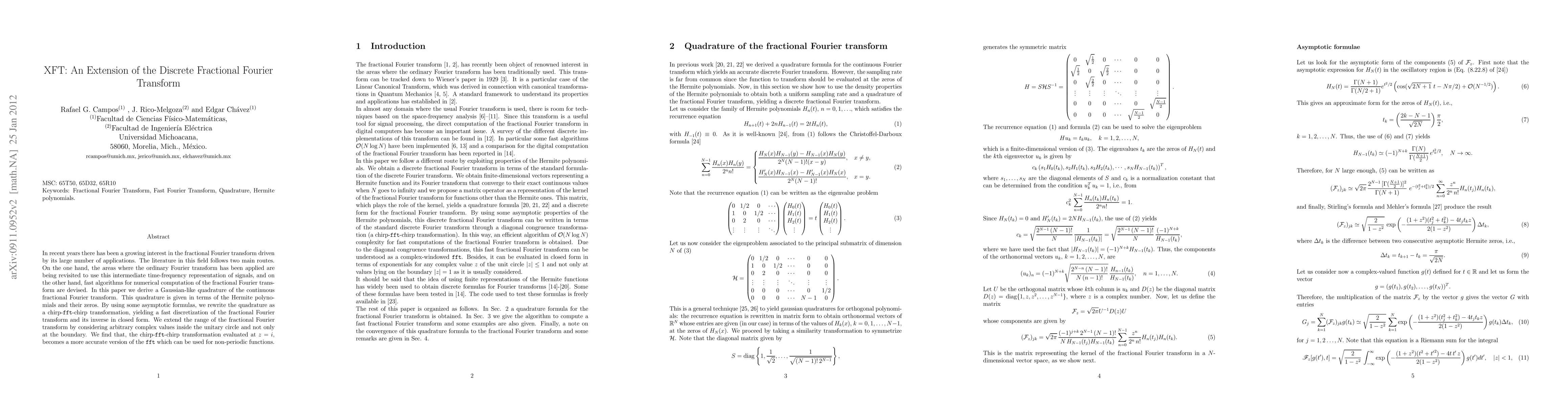 The paper proposes a new fast discretization method, termed XFT, for the fractional Fourier transform using a Gaussian-like quadrature based on Hermite polynomials, extending its application to complex values inside the unitary circle and providing a more accurate version of the FFT for non-periodic functions.
