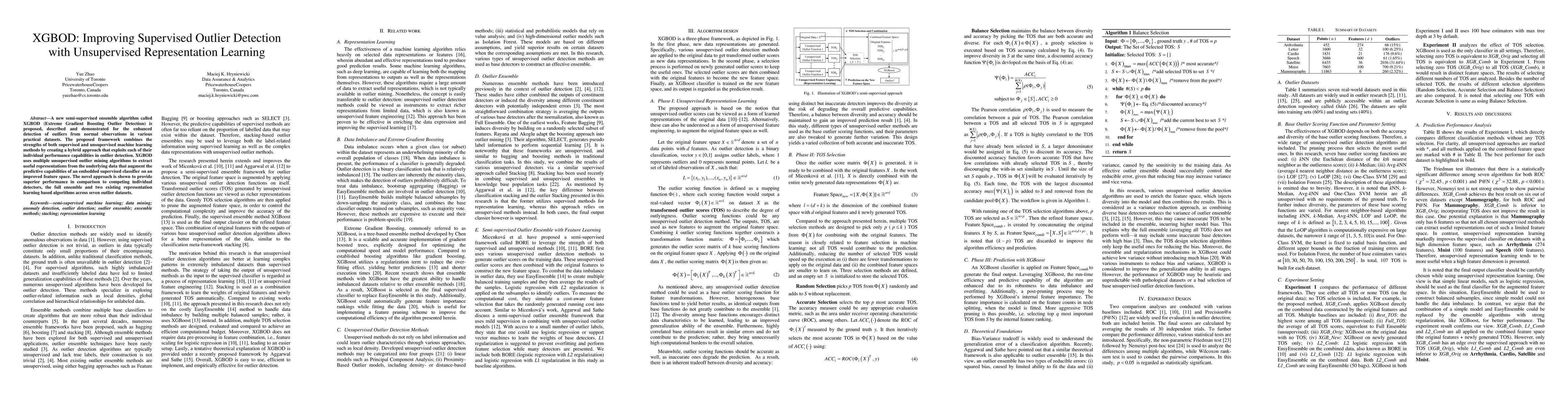 XGBOD is a semi-supervised ensemble algorithm that combines supervised and unsupervised learning for enhanced outlier detection. It leverages unsupervised methods to create better representations, improving the performance of a supervised classifier and outperforming other outlier detection techniques across multiple datasets.