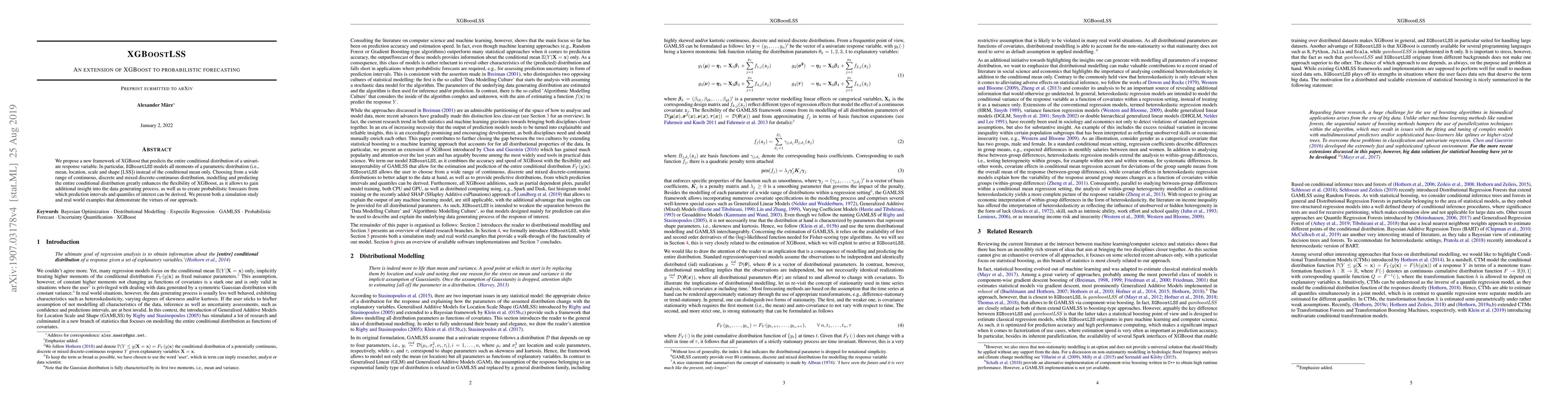 We propose a new framework of XGBoost that predicts the entire conditional distribution of a univariate response variable. In particular, XGBoostLSS models all moments of a parametric distribution (i.e., mean, location, scale and shape [LSS]) instead of the conditional mean only. Choosing from a wide range of continuous, discrete and mixed discrete-continuous distribution, modelling and predicting the entire conditional distribution greatly enhances the flexibility of XGBoost, as it allows to gain additional insight into the data generating process, as well as to create probabilistic forecasts from which prediction intervals and quantiles of interest can be derived. We present both a simulation study and real world examples that demonstrate the virtues of our approach.