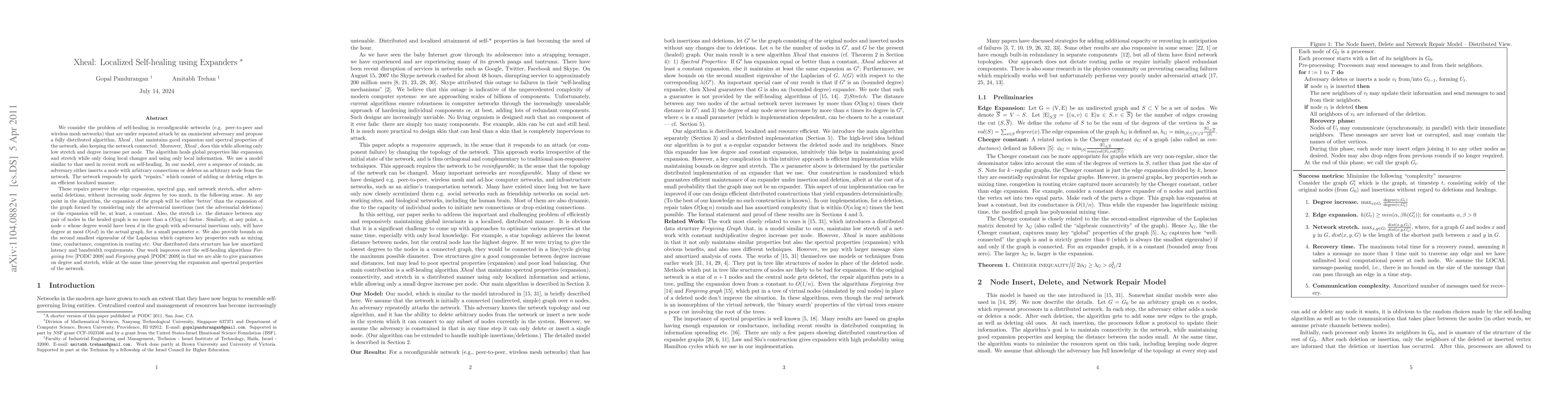 Xheal is a distributed self-healing algorithm for reconfigurable networks that maintains network connectivity and expansion properties while minimizing local changes and degree increases. It improves upon previous algorithms by providing better guarantees on degree and stretch, ensuring the expansion remains either better than adversarial insertions or at least constant, with a distance stretch of $O(\log n)$.