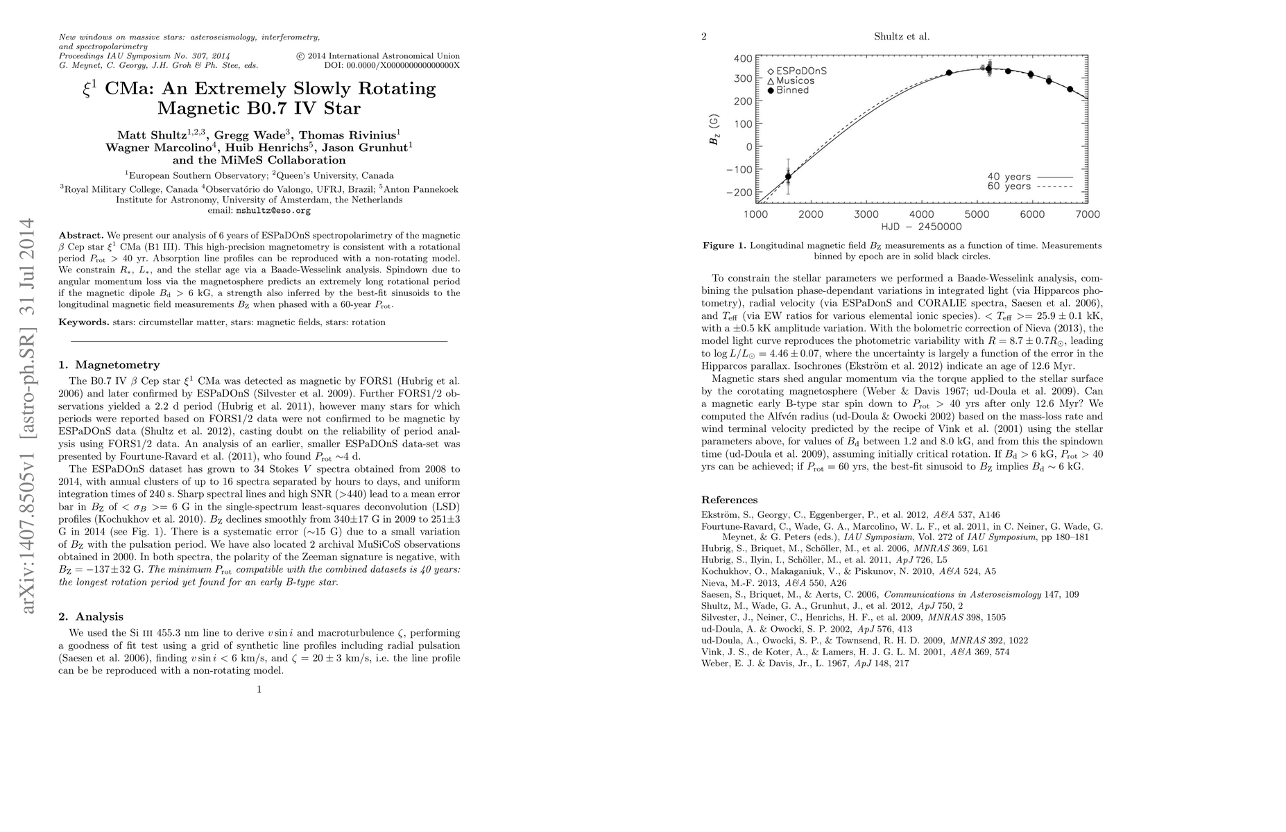 We present our analysis of 6 years of ESPaDOnS spectropolarimetry of the magnetic $\beta$ Cep star $\xi^1$ CMa (B0.7 IV). This high-precision magnetometry is consistent with a rotational period $P{\rm rot} >$ 40 yr. Absorption line profiles can be reproduced with a non-rotating model. We constrain $R_*$, $L_*$, and the stellar age via a Baade-Wesselink analysis. Spindown due to angular momentum loss via the magnetosphere predicts an extremely long rotational period if the magnetic dipole $B_{\rm d} > 6$ kG, a strength also inferred by the best-fit sinusoids to the longitudinal magnetic field measurements $B_{\rm Z}$ when phased with a 60-year $P_{\rm rot}$.