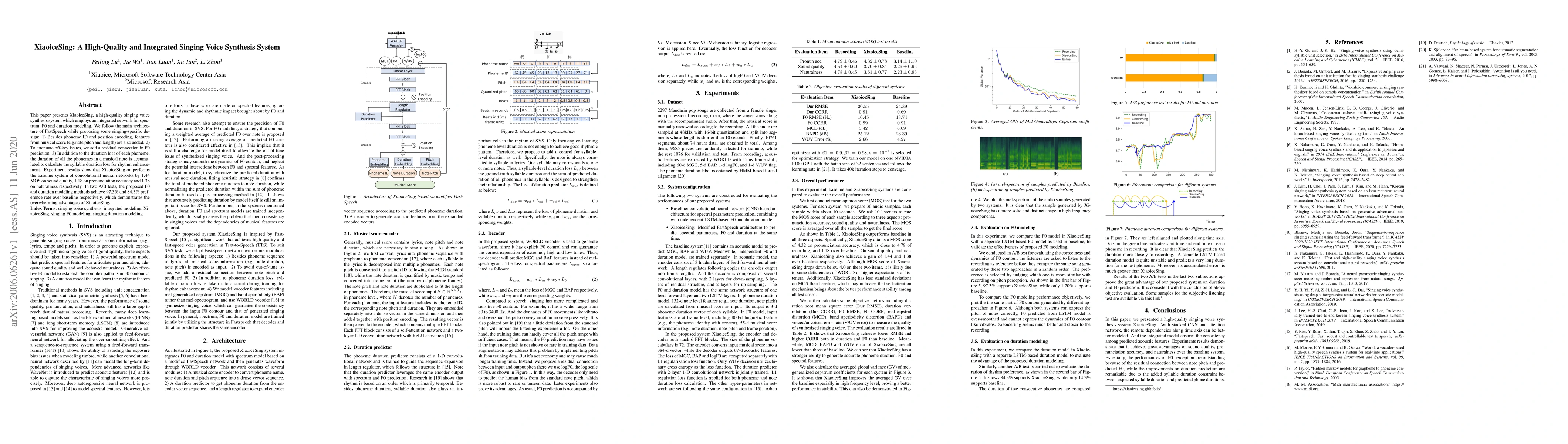 XiaoiceSing is a high-quality singing voice synthesis system that integrates spectrum, F0, and duration modeling using an enhanced FastSpeech architecture. It incorporates musical score features and introduces improvements like residual connections and syllable duration loss for better pitch and rhythm, achieving superior sound quality, pronunciation, and naturalness over baseline systems.