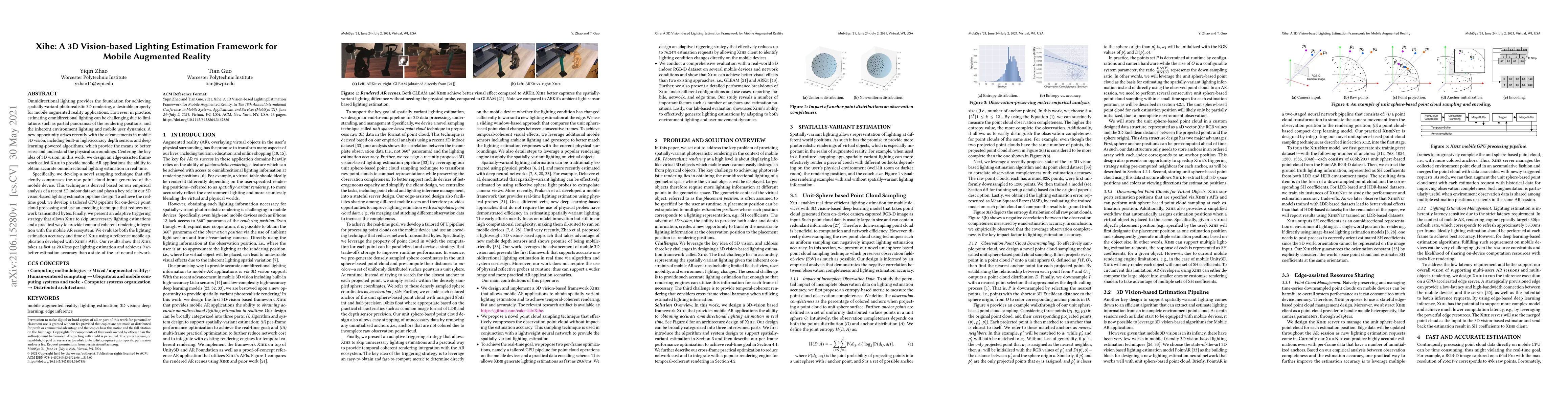 Xihe is an edge-assisted framework leveraging 3D vision for real-time omnidirectional lighting estimation in mobile augmented reality. It employs a novel sampling technique and GPU pipeline to achieve fast and accurate lighting estimations, outperforming existing neural network methods.