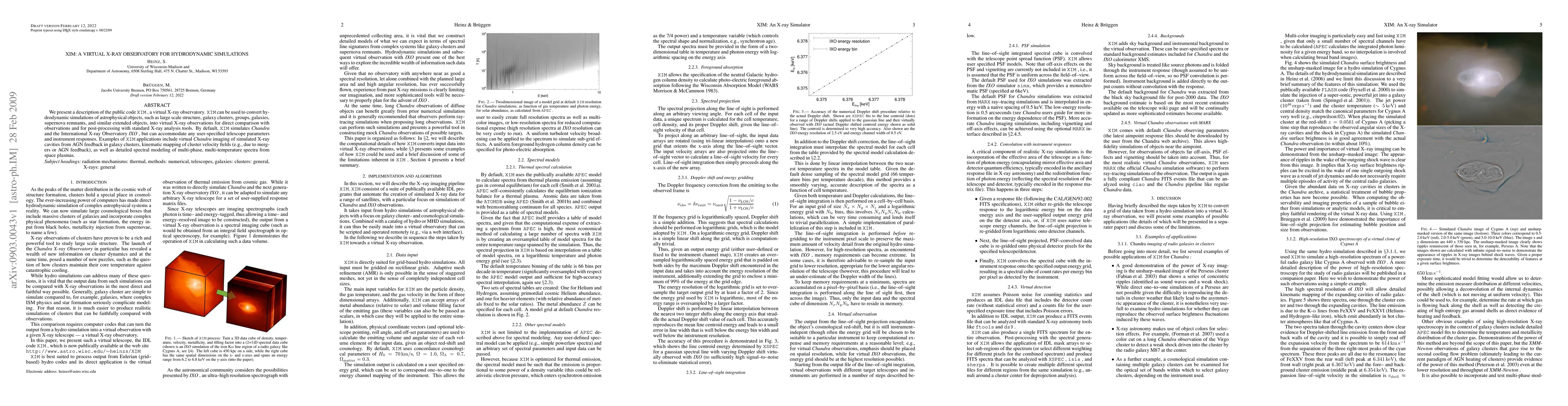 We present a description of the public code XIM, a virtual X-ray observatory. XIM can be used to convert hydrodynamic simulations of astrophysical objects, such as large scale structure, galaxy clusters, groups, galaxies, supernova remnants, and similar extended objects, into virtual X-ray observations for direct comparison with observations and for post-processing with standard X-ray analysis tools. By default, XIM simulates Chandra and the International X-ray Observatory (IXO), but can accommodate any user-specified telescope parameters and instrument responses. Examples of XIM applications include virtual Chandra imaging of simulated X-ray cavities from AGN feedback in galaxy clusters, kinematic mapping of cluster velocity fields (e.g., due to mergers or AGN feedback), as well as detailed spectral modeling of multi-phase, multi-temperature spectra from space plasmas.
