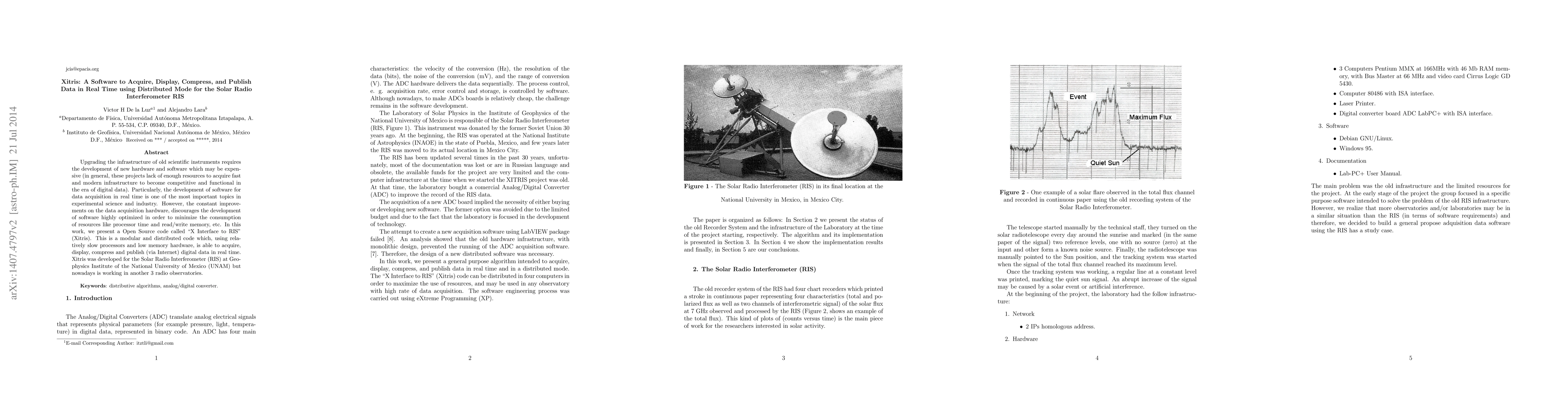 Upgrading the infrastructure of old scientific instruments requires the development of new hardware and software which may be expensive (in general, these projects lack of enough resources to acquire fast and modern infrastructure to become ompetitive and functional in the era of digital data). Particularly, the development of software for data acquisition in real time is one of the most important topics in experimental science and industry. However, the constant improvements on the data acquisition hardware, discourages the development of software highly optimized in order to minimize the consumption of resources like processor time and read/write memory, etc. In this work, we present a Open Source code called X Interface to RIS (Xitris). This is a modular and distributed code which, using relatively slow processors and low memory hardware, is able to acquire, display, compress and publish (via Internet) digital data in real time. Xitris was developed for the Solar Radio Interferometer (RIS) at Geophysics Institute of the National University of Mexico (UNAM) but nowadays is working in another 3 radio observatories.
