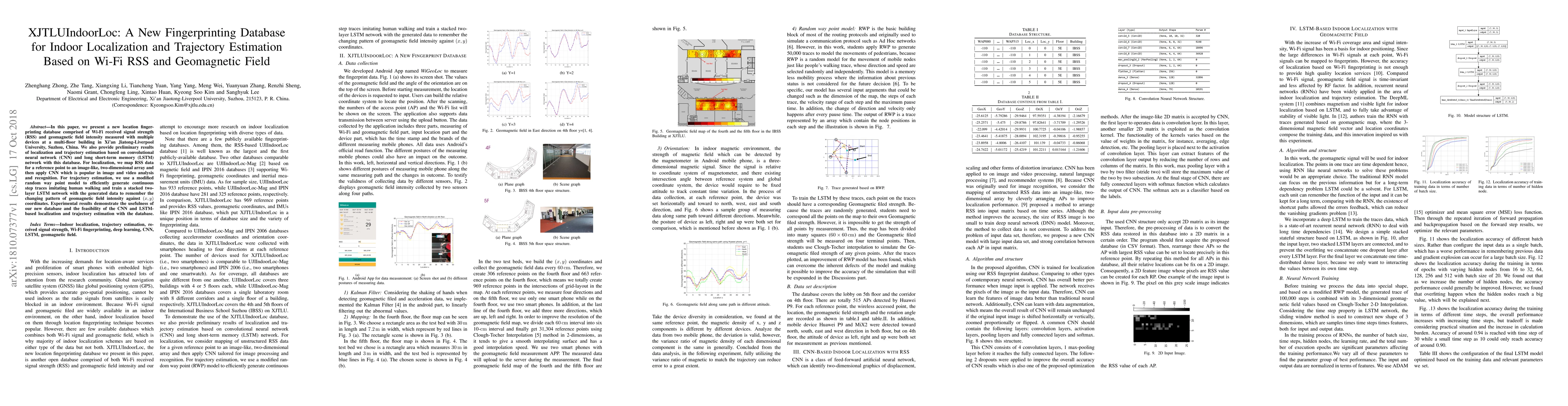 The paper introduces XJTLUIndoorLoc, a fingerprinting database using Wi-Fi RSS and geomagnetic field data for indoor localization and trajectory estimation at Xi'an Jiatong-Liverpool University. It employs Convolutional Neural Networks (CNN) for localization, transforming RSS data into image-like arrays, and Long Short-Term Memory (LSTM) networks for trajectory estimation, training on modified random waypoint model data. Experiments show the database's effectiveness and the viability of the proposed methods.