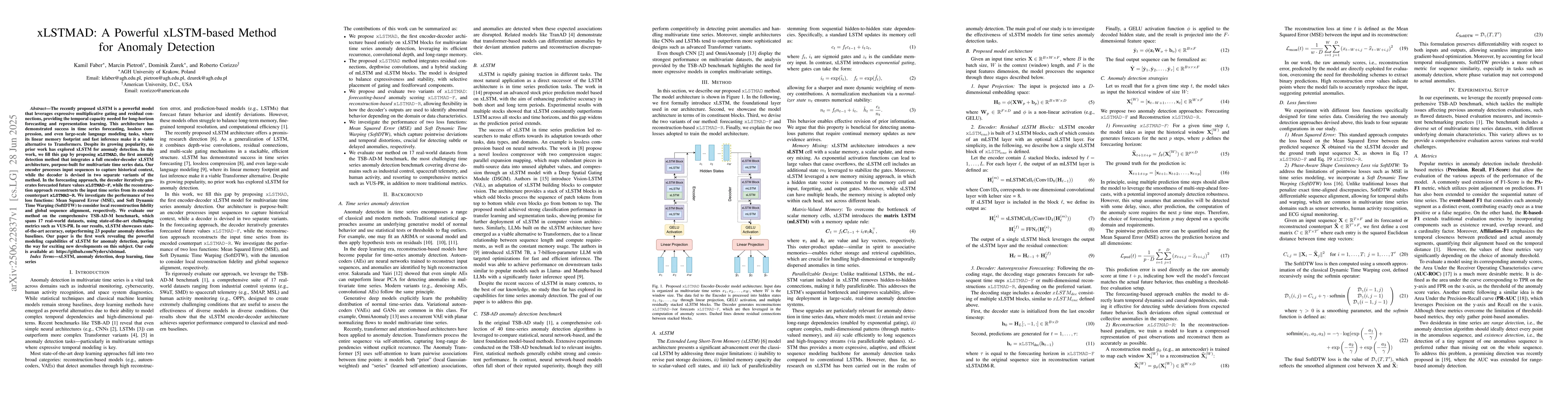 The recently proposed xLSTM is a powerful model that leverages expressive multiplicative gating and residual connections, providing the temporal capacity needed for long-horizon forecasting and representation learning. This architecture has demonstrated success in time series forecasting, lossless compression, and even large-scale language modeling tasks, where its linear memory footprint and fast inference make it a viable alternative to Transformers. Despite its growing popularity, no prior work has explored xLSTM for anomaly detection. In this work, we fill this gap by proposing xLSTMAD, the first anomaly detection method that integrates a full encoder-decoder xLSTM architecture, purpose-built for multivariate time series data. Our encoder processes input sequences to capture historical context, while the decoder is devised in two separate variants of the method. In the forecasting approach, the decoder iteratively generates forecasted future values xLSTMAD-F, while the reconstruction approach reconstructs the input time series from its encoded counterpart xLSTMAD-R. We investigate the performance of two loss functions: Mean Squared Error (MSE), and Soft Dynamic Time Warping (SoftDTW) to consider local reconstruction fidelity and global sequence alignment, respectively. We evaluate our method on the comprehensive TSB-AD-M benchmark, which spans 17 real-world datasets, using state-of-the-art challenging metrics such as VUS-PR. In our results, xLSTM showcases state-of-the-art accuracy, outperforming 23 popular anomaly detection baselines. Our paper is the first work revealing the powerful modeling capabilities of xLSTM for anomaly detection, paving the way for exciting new developments on this subject. Our code is available at: https://github.com/Nyderx/xlstmad