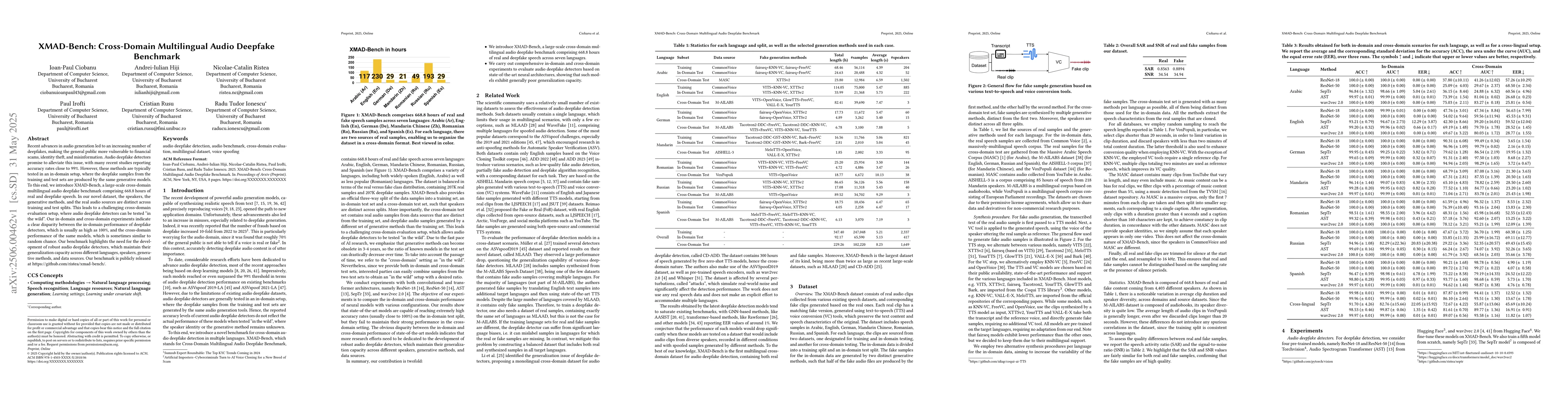 The paper introduces XMAD-Bench, a cross-domain multilingual audio deepfake benchmark with 668.8 hours of real and deepfake speech. It separates speakers, generative methods, and real audio sources between training and test splits for challenging cross-domain evaluation.