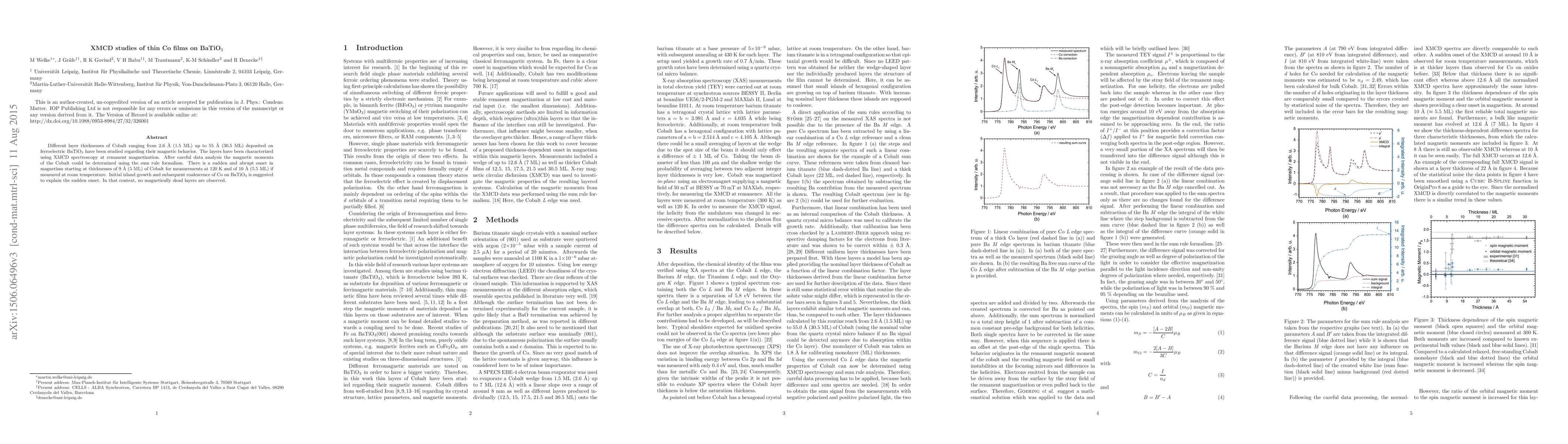 Different layer thicknesses of Cobalt ranging from 2.6 {\AA} (1.5 ML) up to 55 {\AA} (30.5 ML) deposited on ferroelectric BaTiO$_3$ have been studied regarding their magnetic behavior. The layers have been characterized using XMCD spectroscopy at remanent magnetization. After careful data analysis the magnetic moments of the Cobalt could be determined using the sum rule formalism. There is a sudden and abrupt onset in magnetism starting at thicknesses of 9 {\AA} (5 ML) of Cobalt for measurements at 120 K and of 10 {\AA} (5.5 ML) if measured at room temperature. Initial island growth and subsequent coalescence of Co on BaTiO$_3$ is suggested to explain the sudden onset. In that context, no magnetically dead layers are observed.