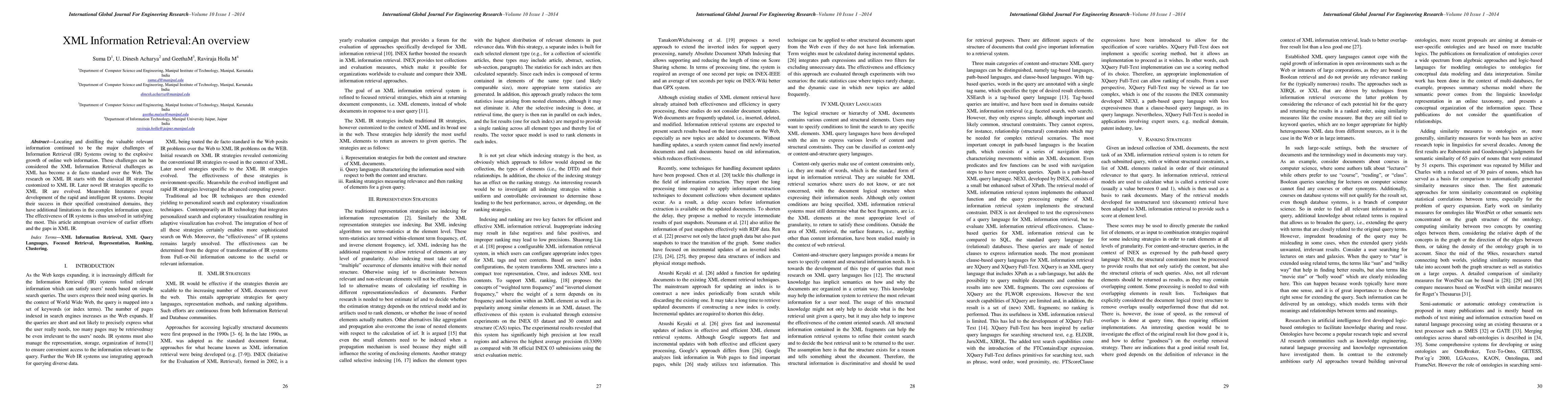 This paper provides an overview of XML Information Retrieval (IR) challenges and the evolution of IR strategies tailored for XML data, highlighting both classical and novel approaches. Despite advancements, the effectiveness of XML IR systems remains limited in complex information spaces, underscoring the need for further research.
