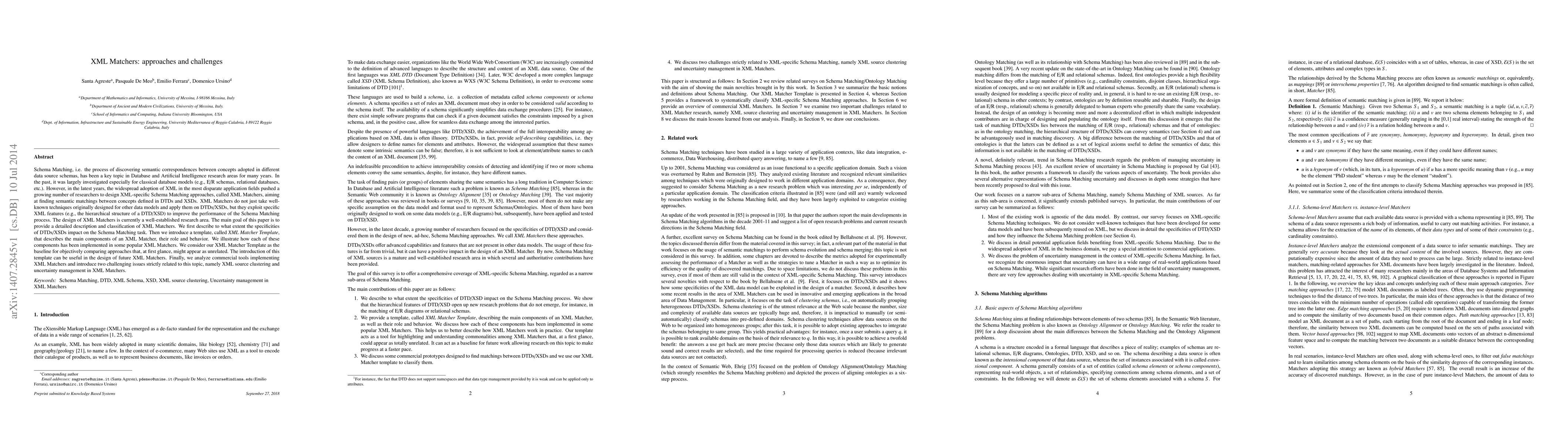This paper explores XML Matchers, which aim to discover semantic correspondences between XML schemas, leveraging XML's unique features. It provides a detailed classification of XML Matchers, outlines a template for their components, and discusses challenges like XML source clustering and uncertainty management.