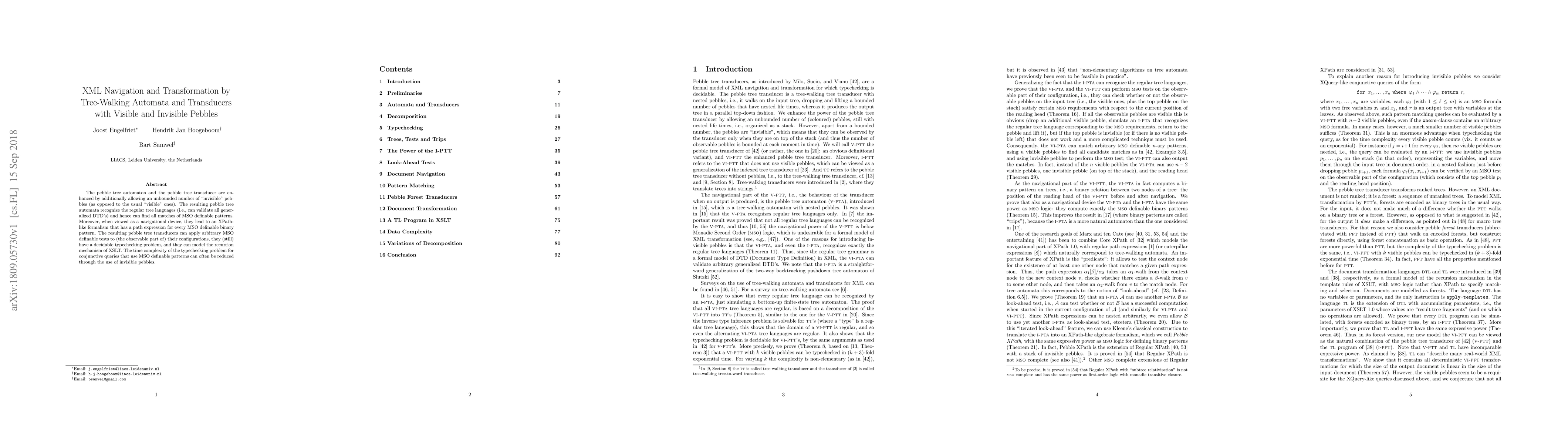 The pebble tree automaton and the pebble tree transducer are enhanced by additionally allowing an unbounded number of "invisible" pebbles (as opposed to the usual "visible" ones). The resulting pebble tree automata recognize the regular tree languages (i.e., can validate all generalized DTD's) and hence can find all matches of MSO definable patterns. Moreover, when viewed as a navigational device, they lead to an XPath-like formalism that has a path expression for every MSO definable binary pattern. The resulting pebble tree transducers can apply arbitrary MSO definable tests to (the observable part of) their configurations, they (still) have a decidable typechecking problem, and they can model the recursion mechanism of XSLT. The time complexity of the typechecking problem for conjunctive queries that use MSO definable patterns can often be reduced through the use of invisible pebbles.