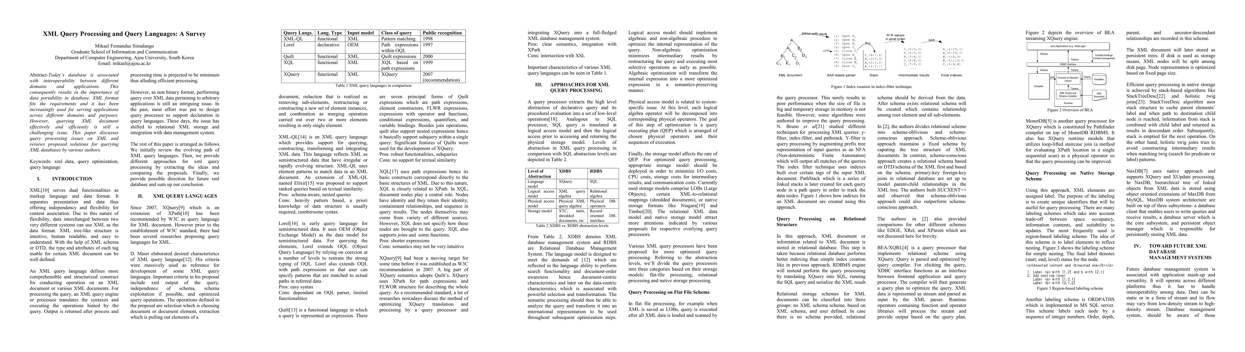 The paper presents a survey of query processing and languages for XML databases, comparing various XML query languages such as XML-QL, Lorel, Quilt, XQL, and XQuery.