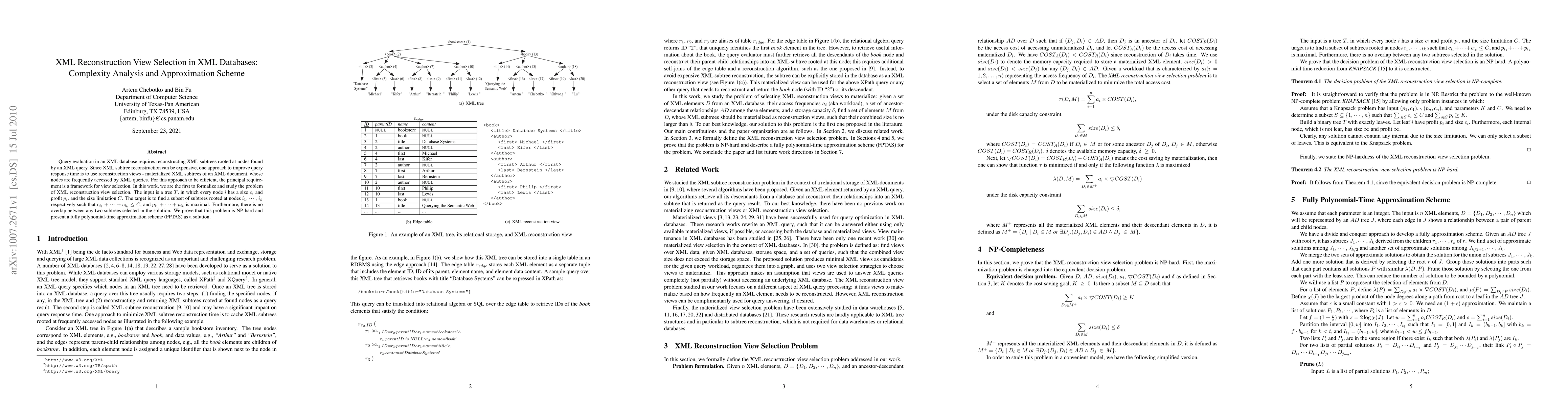 This paper formalizes and analyzes the problem of selecting XML reconstruction views to optimize query response time in XML databases. It proves the problem to be NP-hard and proposes a fully polynomial-time approximation scheme (FPTAS) to address it.