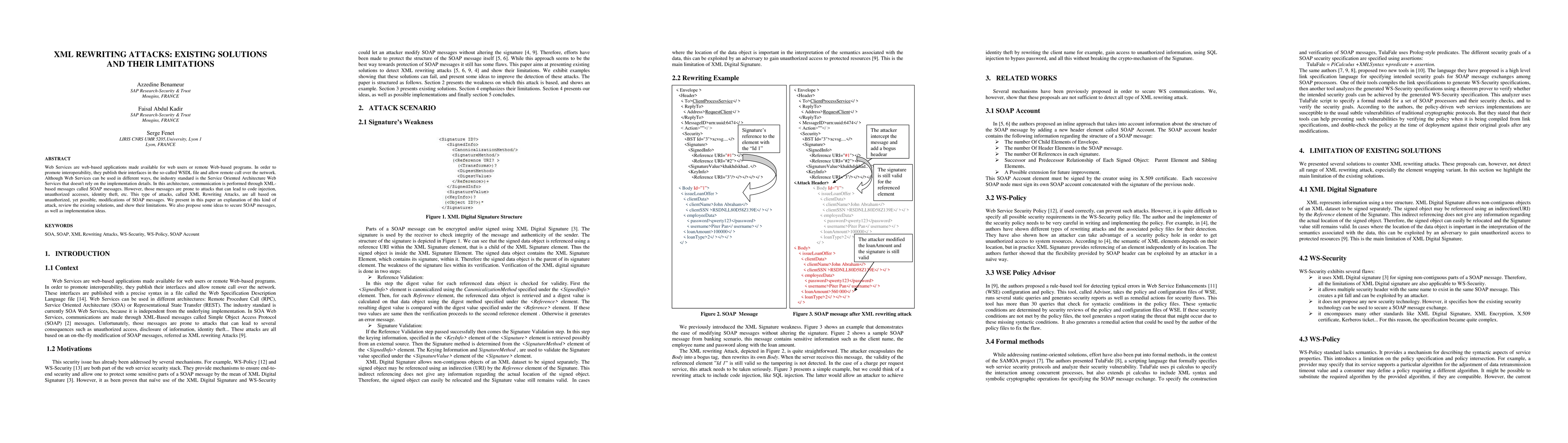 Web Services are web-based applications made available for web users or remote Web-based programs. In order to promote interoperability, they publish their interfaces in the so-called WSDL file and allow remote call over the network. Although Web Services can be used in different ways, the industry standard is the Service Oriented Architecture Web Services that doesn't rely on the implementation details. In this architecture, communication is performed through XML-based messages called SOAP messages. However, those messages are prone to attacks that can lead to code injection, unauthorized accesses, identity theft, etc. This type of attacks, called XML Rewriting Attacks, are all based on unauthorized, yet possible, modifications of SOAP messages. We present in this paper an explanation of this kind of attack, review the existing solutions, and show their limitations. We also propose some ideas to secure SOAP messages, as well as implementation ideas.