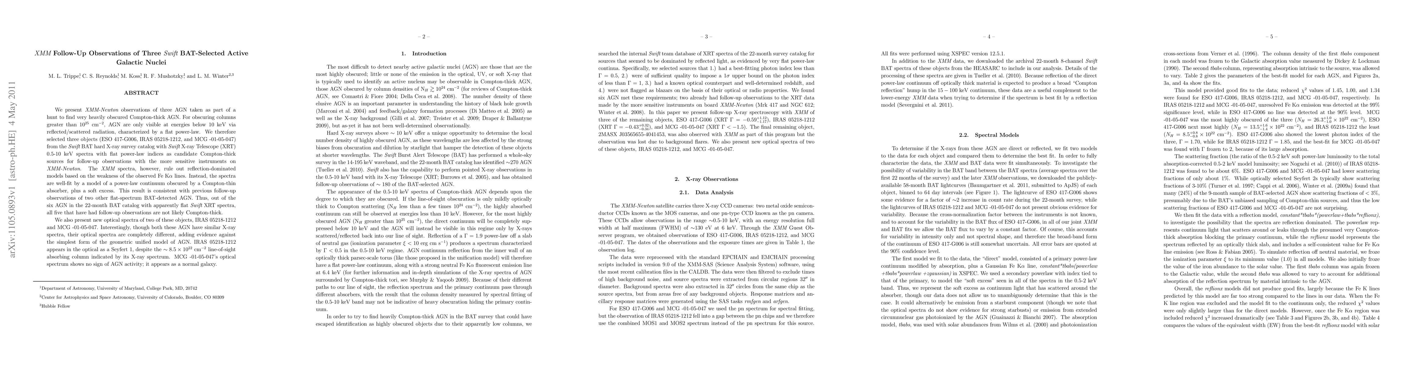 We present XMM-Newton observations of three AGN taken as part of a hunt to find very heavily obscured Compton-thick AGN. For obscuring columns greater than 10^25 cm^-2, AGN are only visible at energies below 10 keV via reflected/scattered radiation, characterized by a flat power-law. We therefore selected three objects (ESO 417-G006, IRAS 05218-1212, and MCG -01-05-047) from the Swift BAT hard X-ray survey catalog with Swift X-ray Telescope XRT 0.5-10 keV spectra with flat power-law indices as candidate Compton-thick sources for follow-up observations with the more sensitive instruments on XMM-Newton. The XMM spectra, however, rule out reflection-dominated models based on the weakness of the observed Fe K-alpha lines. Instead, the spectra are well-fit by a model of a power-law continuum obscured by a Compton-thin absorber, plus a soft excess. This result is consistent with previous follow-up observations of two other flat-spectrum BAT-detected AGN. Thus, out of the six AGN in the 22-month BAT catalog with apparently flat Swift XRT spectra, all five that have had follow-up observations are not likely Compton-thick. We also present new optical spectra of two of these objects, IRAS 05218-1212 and MCG -01-05-047. Interestingly, though both these AGN have similar X-ray spectra, their optical spectra are completely different, adding evidence against the simplest form of the geometric unified model of AGN. IRAS 05218-1212 appears in the optical as a Seyfert 1, despite the ~8.5x10^22 cm^-2 line-of-sight absorbing column indicated by its X-ray spectrum. MCG -01-05-047's optical spectrum shows no sign of AGN activity; it appears as a normal galaxy.