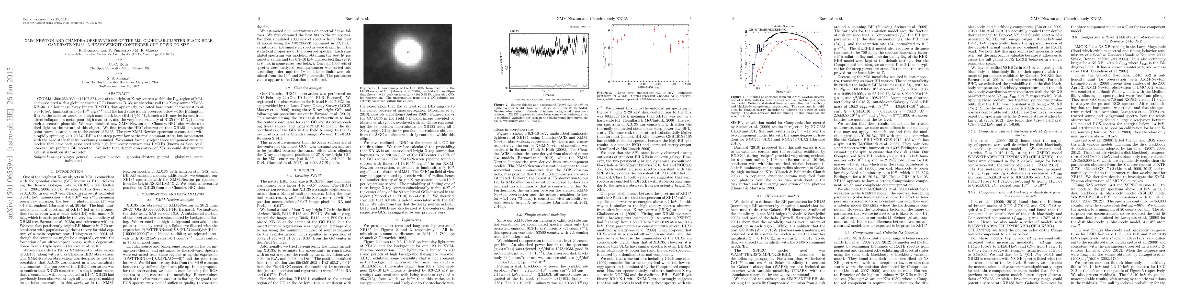 CXOM31 J004252.030+413107.87 is one of the brightest X-ray sources within the D_25 region of M31, and associated with a globular cluster (GC) known as B135; we therefore call this X-ray source XB135. XB135 is a low mass X-ray binary (LMXB) that apparently exhibited hard state characteristics at 0.3--10 keV luminosities 4--6 E+38 erg/s, and the hard state is only observed below ~10% Eddington. If true, the accretor would be a high mass black hole (BH) (> ~50 M_Sun); such a BH may be formed from direct collapse of a metal-poor, high mass star, and the very low metalicity of B135 (0.015 Z_Sun) makes such a scenario plausible. We have obtained new XMM-Newton and Chandra HRC observations to shed light on the nature of this object. We find from the HRC observation that XB135 is a single point source located close to the center of B135. The new XMM-Newton spectrum is consistent with a rapidly spinning ~10--20 M_Sun BH in the steep power law or thermal dominant state, but inconsistent with the hard state that we previously assumed. We cannot formally reject three component emission models that have been associated with high luminosity neutron star LMXBs (known as Z-sources); however, we prefer a BH accretor. We note that deeper observation of XB135 could discriminate against a neutron star accretor.