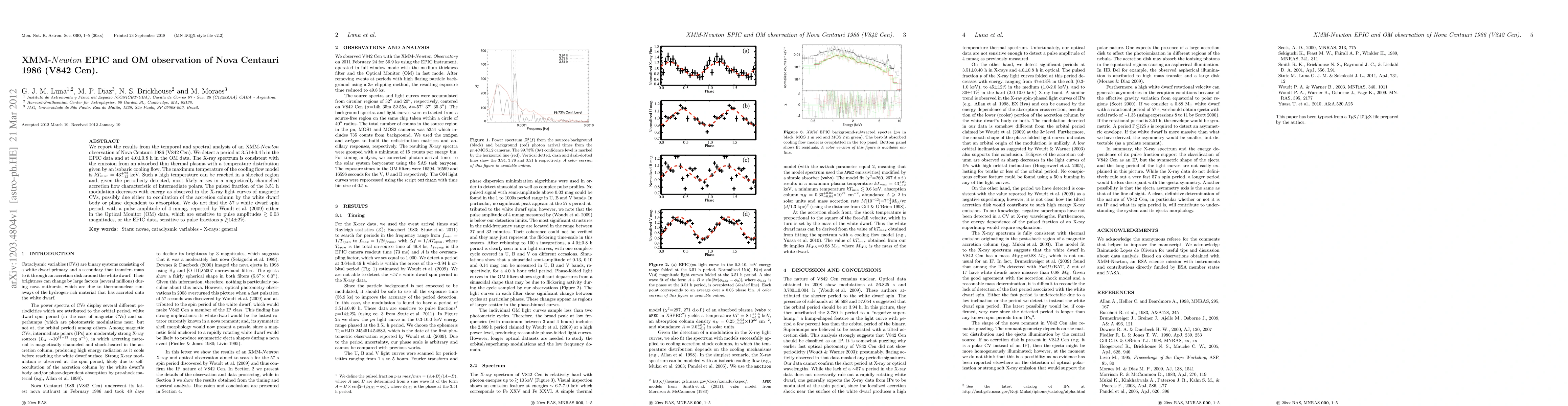 We report the results from the temporal and spectral analysis of an XMM-Newton observation of Nova Centauri 1986 (V842 Cen). We detect a period at 3.51$\pm$0.4 h in the EPIC data and at 4.0$\pm$0.8 h in the OM data. The X-ray spectrum is consistent with the emission from an absorbed thin thermal plasma with a temperature distribution given by an isobaric cooling flow. The maximum temperature of the cooling flow model is $kT_{max}=43_{-12}^{+23}$ keV. Such a high temperature can be reached in a shocked region and, given the periodicity detected, most likely arises in a magnetically-channelled accretion flow characteristic of intermediate polars. The pulsed fraction of the 3.51 h modulation decreases with energy as observed in the X-ray light curves of magnetic CVs, possibly due either to occultation of the accretion column by the white dwarf body or phase-dependent to absorption. We do not find the 57 s white dwarf spin period, with a pulse amplitude of 4 mmag, reported by Woudt et al. (2009) either in the Optical Monitor (OM) data, which are sensitive to pulse amplitudes $\gtrsim$ 0.03 magnitudes, or the EPIC data, sensitive to pulse fractions $p \gtrsim$ 14 $\pm$2%.