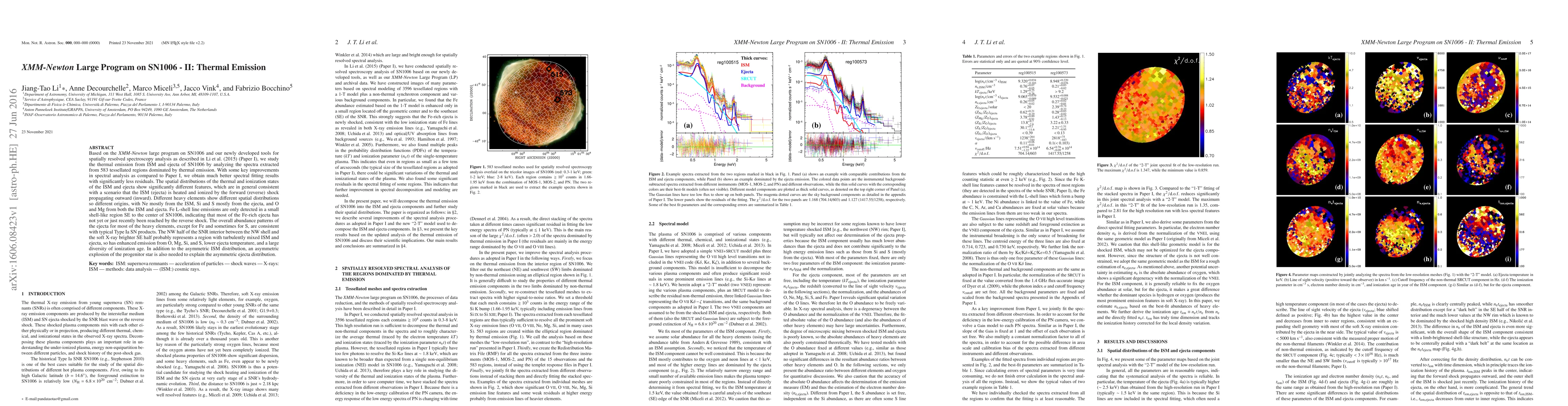 Based on the XMM-Newton large program on SN1006 and our newly developed spatially resolved spectroscopy tools (Paper~I), we study the thermal emission from ISM and ejecta of SN1006 by analyzing the spectra extracted from 583 tessellated regions dominated by thermal emission. With some key improvements in spectral analysis as compared to Paper~I, we obtain much better spectral fitting results with less residuals. The spatial distributions of the thermal and ionization states of the ISM and ejecta show different features, which are consistent with a scenario that the ISM (ejecta) is heated and ionized by the forward (reverse) shock propagating outward (inward). Different elements have different spatial distributions and origins, with Ne mostly from the ISM, Si and S from the ejecta, and O and Mg from both ISM and ejecta. Fe L-shell lines are only detected in a small shell-like region SE to the center of SN1006, indicating that most of the Fe-rich ejecta has not yet or just recently been reached by the reverse shock. The overall ejecta abundance patterns for most of the heavy elements, except for Fe and sometimes S, are consistent with typical Type~Ia SN products. The NW half of the SNR interior probably represents a region with turbulently mixed ISM and ejecta, so has enhanced emission from O, Mg, Si, S, lower ejecta temperature, and a large diversity of ionization age. In addition to the asymmetric ISM distribution, an asymmetric explosion of the progenitor star is also needed to explain the asymmetric ejecta distribution.
