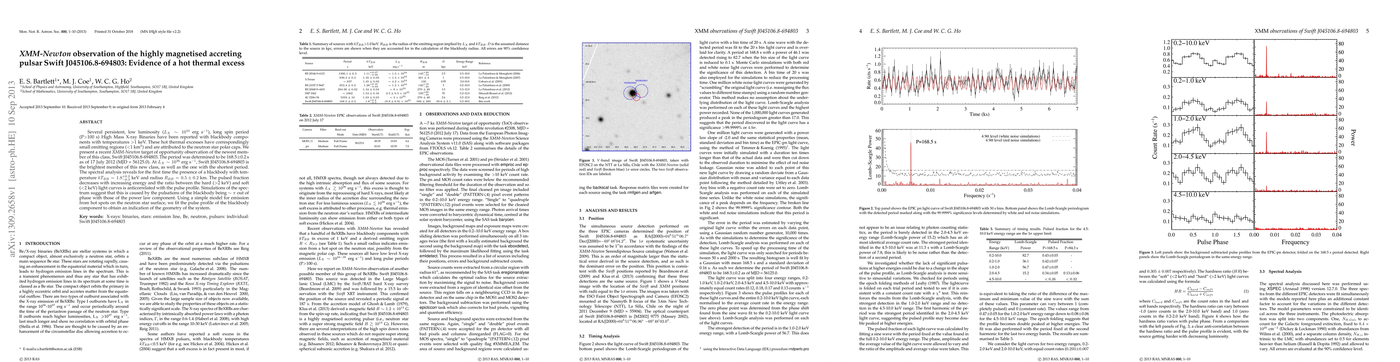 Several persistent, low luminosity (L_X 10^{34} erg s^{-1}), long spin period (P>100 s) High Mass X-ray Binaries have been reported with blackbody components with temperatures >1 keV. These hot thermal excesses have correspondingly small emitting regions (<1 km^2) and are attributed to the neutron star polar caps. We present a recent XMM-Newton target of opportunity observation of the newest member of this class, Swift J045106.8-694803. The period was determined to be 168.5+/-0.2 s as of 17 July 2012 (MJD = 56125.0). At $L_X 10^{36} erg s^{-1}, Swift J045106.8-694803 is the brightest member of this new class, as well as the one with the shortest period. The spectral analysis reveals for the first time the presence of a blackbody with temperature kT_{BB}=1.8^{+0.2}_{-0.3} keV and radius R_{BB}=0.5+/-0.2 km. The pulsed fraction decreases with increasing energy and the ratio between the hard (>2 keV) and soft (<2 keV) light curves is anticorrelated with the pulse profile. Simulations of the spectrum suggest that this is caused by the pulsations of the blackbody being pi out of phase with those of the power law component. Using a simple model for emission from hot spots on the neutron star surface, we fit the pulse profile of the blackbody component to obtain an indication of the geometry of the system.