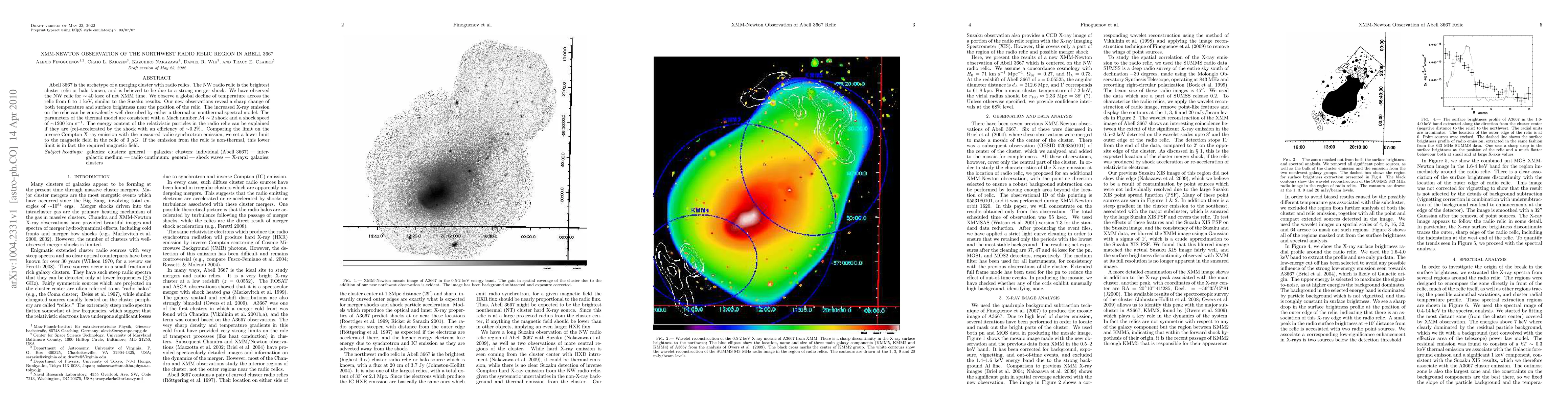 Abell 3667 is the archetype of a merging cluster with radio relics. The NW radio relic is the brightest cluster relic or halo known, and is believed to be due to a strong merger shock. We have observed the NW relic for 40 ksec of net XMM time. We observe a global decline of temperature across the relic from 6 to 1 keV, similar to the Suzaku results. Our new observations reveal a sharp change of both temperature and surface brightness near the position of the relic. The increased X-ray emission on the relic can be equivalently well described by either a thermal or nonthermal spectral model. The parameters of the thermal model are consistent with a Mach number M~2 shock and a shock speed of ~1200 km s^-1. The energy content of the relativistic particles in the radio relic can be explained if they are (re)-accelerated by the shock with an efficiency of ~0.2%. Comparing the limit on the inverse Compton X-ray emission with the measured radio synchrotron emission, we set a lower limit to the magnetic field in the relic of 3 muG. If the emission from the relic is non-thermal, this lower limit is in fact the required magnetic field.