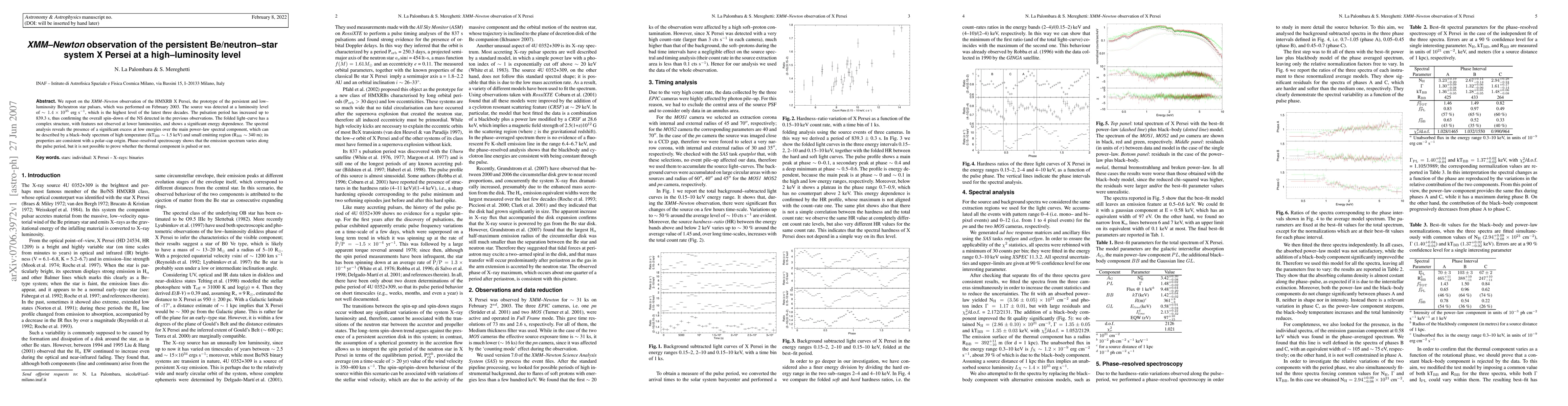 We report on the XMM-Newton observation of the HMXRB X Persei, the prototype of the persistent and low-luminosity Be/neutron star pulsars, which was performed on February 2003. The source was detected at a luminosity level of ~ 1.4x10^35 erg/s, which is the highest level of the latest three decades. The pulsation period has increased up to 839.3 s, thus confirming the overall spin-down of the NS detected in the previous observations. The folded light-curve has a complex structure, with features not observed at lower luminosities, and shows a significant energy dependence. The spectral analysis reveals the presence of a significant excess at low energies over the main power-law spectral component, which can be described by a black-body spectrum of high temperature (kT_BB ~ 1.5 keV) and small emitting region (R_BB ~ 340 m); its properties are consistent with a polar-cap origin. Phase-resolved spectroscopy shows that the emission spectrum varies along the pulse period, but it is not possible to prove whether the thermal component is pulsed or not.