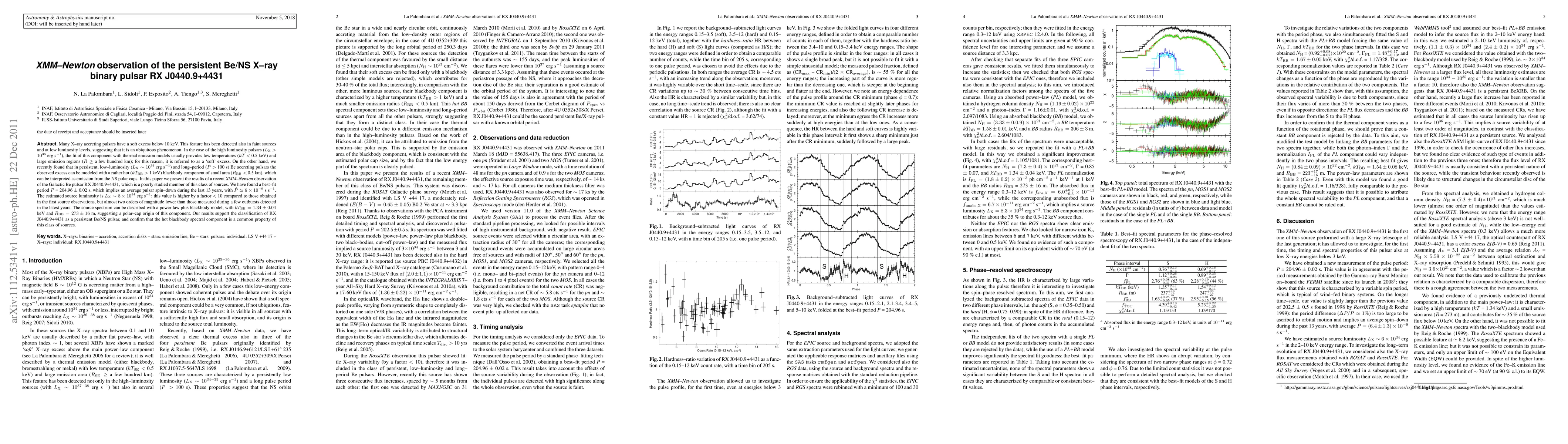 This paper reports an XMM-Newton observation of the poorly studied Be/NS X-ray pulsar RX J0440.9+4431, finding a best-fit period of 204.96 s and confirming its persistent nature. The source spectrum includes a hot blackbody component consistent with emission from the neutron star's polar caps.