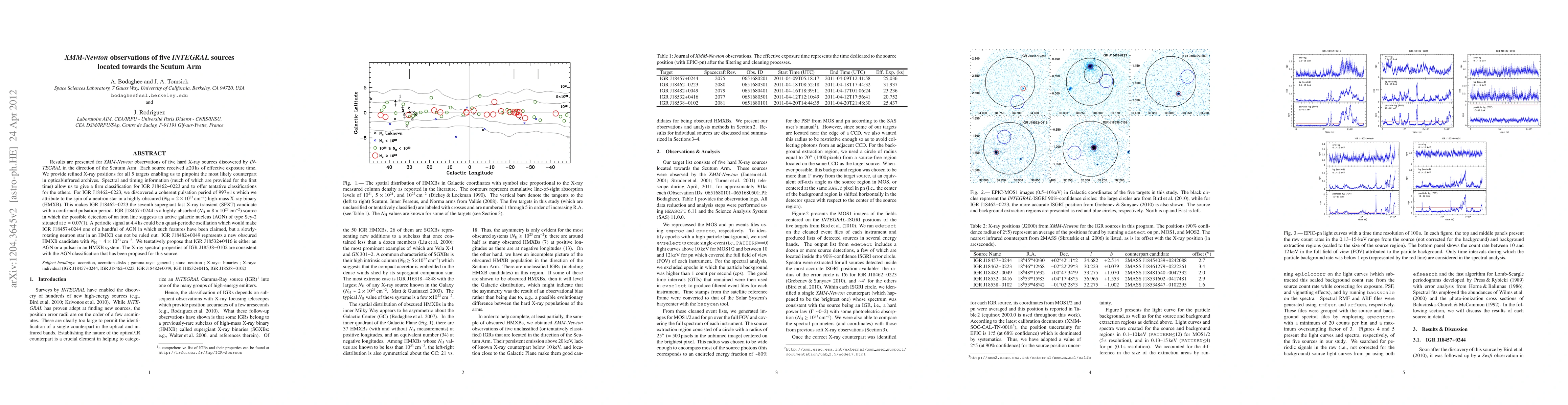 Results are presented for XMM-Newton observations of five hard X-ray sources discovered by INTEGRAL in the direction of the Scutum Arm. Each source received more than 20 ks of effective exposure time. We provide refined X-ray positions for all five targets enabling us to pinpoint the most likely counterpart in optical/infrared archives. Spectral and timing information (much of which are provided for the first time) allow us to give a firm classification for IGR J18462-0223 and to offer tentative classifications for the others. For IGR J18462-0223, we discovered a coherent pulsation period of 997+-1 s which we attribute to the spin of a neutron star in a highly-obscured (nH = 2e23 /cm2) high-mass X-ray binary (HMXB). This makes IGR J18462-0223 the seventh supergiant fast X-ray transient (SFXT) candidate with a confirmed pulsation period. IGR J18457+0244 is a highly-absorbed (nH = 8e23 /cm2) source in which the possible detection of an iron line suggests an active galactic nucleus (AGN) of type Sey-2 situated at z = 0.07(1). A periodic signal at 4.4 ks could be a quasi-periodic oscillation which would make IGR J18457+0244 one of a handful of AGN in which such features have been claimed, but a slowly-rotating neutron star in an HMXB can not be ruled out. IGR J18482+0049 represents a new obscured HMXB candidate with nH = 4e23 /cm2. We tentatively propose that IGR J18532+0416 is either an AGN or a pulsar in an HMXB system. The X-ray spectral properties of IGR J18538-0102 are consistent with the AGN classification that has been proposed for this source.