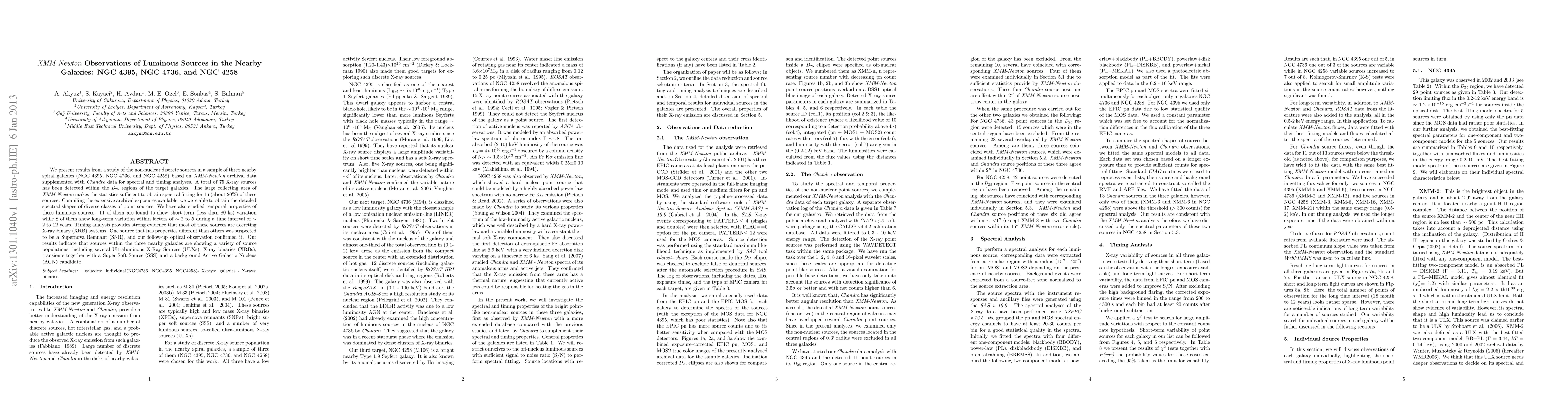 We present results from a study of the non-nuclear discrete sources in a sample of three nearby spiral galaxies (NGC 4395, NGC 4736, and NGC 4258) based on XMM-Newton archival data supplemented with Chandra data for spectral and timing analyses. A total of 75 X-ray sources has been detected within the D25 regions of the target galaxies. The large collecting area of XMM-Newton makes the statistics sufficient to obtain spectral fitting for 16 (about 20%) of these sources. Compiling the extensive archival exposures available, we were able to obtain the detailed spectral shapes of diverse classes of point sources. We have also studied temporal properties of these luminous sources. 11 of them are found to show short-term (less than 80 ks) variation while 8 of them show long-term variation within factors of ~ 2 to 5 during a time interval of ~ 2 to 12 years. Timing analysis provides strong evidence that most of these sources are accreting X-ray binary (XRB) systems. One source that has properties different than others was suspected to be a Supernova Remnant (SNR), and our follow-up optical observation confirmed it. Our results indicate that sources within the three nearby galaxies are showing a variety of source populations, including several Ultraluminous X-Ray Sources (ULXs), X-ray binaries (XRBs), transients together with a Super Soft Source (SSS) and a background Active Galactic Nucleus (AGN) candidate.