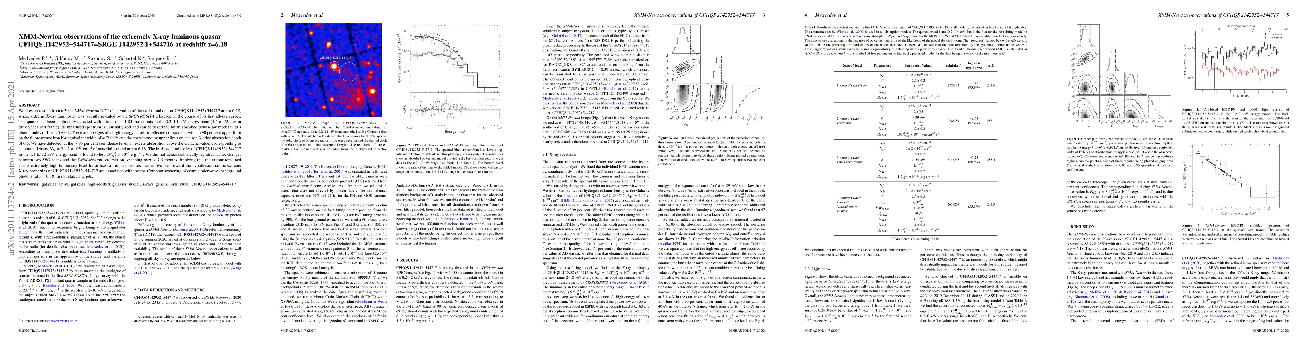 The XMM-Newton observation of the extremely X-ray luminous quasar CFHQS J142952+544717 at redshift z=6.18 revealed a soft X-ray spectrum with no high-energy cutoff, suggesting inverse Compton scattering of cosmic microwave background photons in its jets. The quasar's intrinsic luminosity in the 1.4 to 72 keV band is $5.5 \times 10^{46}$ erg s$^{-1}$, and it showed no significant flux changes over 7.5 months.