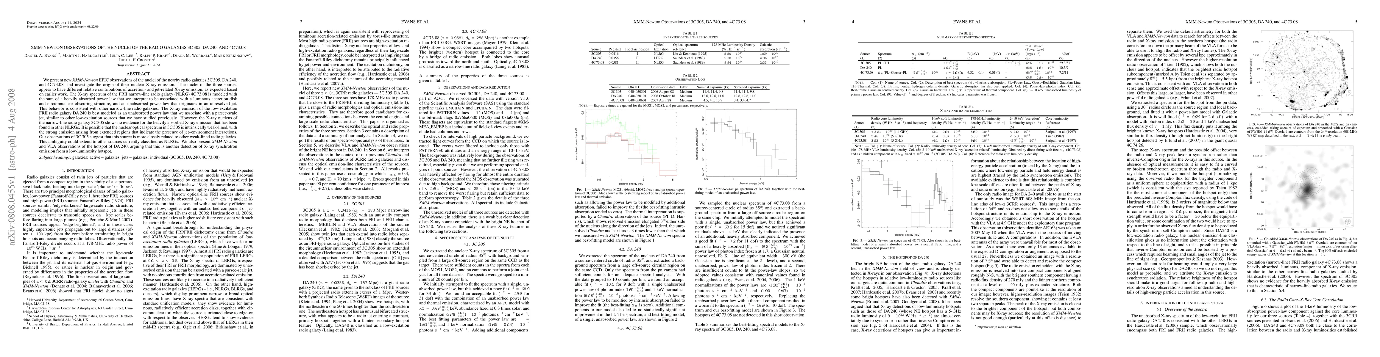 We present new XMM-Newton EPIC observations of the nuclei of the nearby radio galaxies 3C 305, DA 240, and 4C 73.08, and investigate the origin of their nuclear X-ray emission. The nuclei of the three sources appear to have different relative contributions of accretion- and jet-related X-ray emission, as expected based on earlier work. The X-ray spectrum of the FRII narrow-line radio galaxy (NLRG) 4C 73.08 is modeled with the sum of a heavily absorbed power law that we interpret to be associated with a luminous accretion disk and circumnuclear obscuring structure, and an unabsorbed power law that originates in an unresolved jet. This behavior is consistent with other narrow-line radio galaxies. The X-ray emission of the low-excitation FRII radio galaxy DA 240 is best modeled as an unabsorbed power law that we associate with a parsec-scale jet, similar to other low-excitation sources that we have studied previously. However, the X-ray nucleus of the narrow-line radio galaxy 3C 305 shows no evidence for the heavily absorbed X-ray emission that has been found in other NLRGs. It is possible that the nuclear optical spectrum in 3C 305 is intrinsically weak-lined, with the strong emission arising from extended regions that indicate the presence of jet--environment interactions. Our observations of 3C 305 suggest that this source is more closely related to other weak-lined radio galaxies. This ambiguity could extend to other sources currently classified as NLRGs. We also present XMM-Newton and VLA observations of the hotspot of DA 240, arguing that this is another detection of X-ray synchrotron emission from a low-luminosity hotspot.
