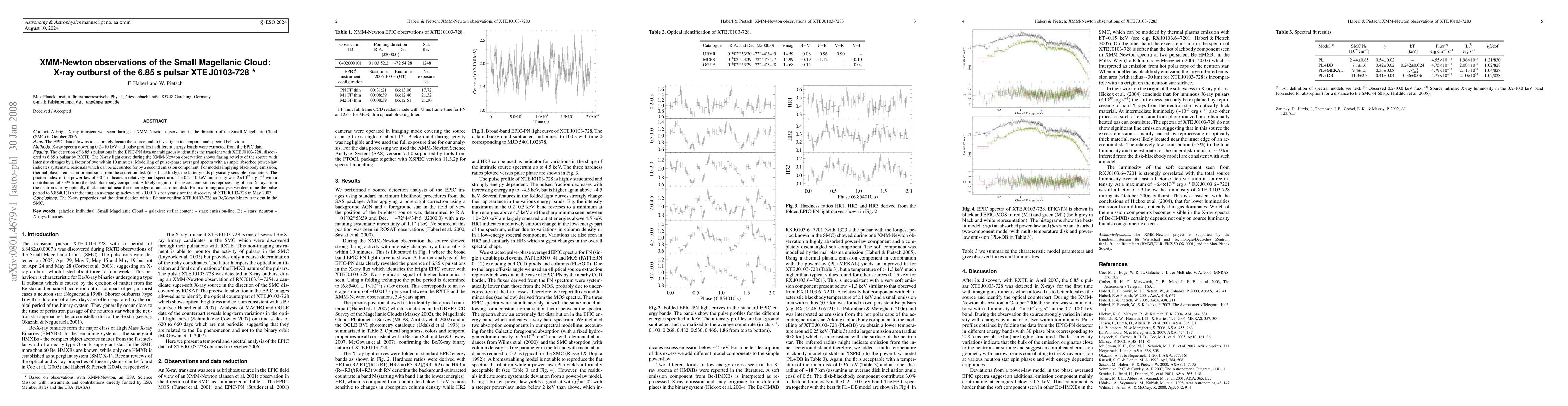 A bright X-ray transient was seen during an XMM-Newton observation in the direction of the Small Magellanic Cloud (SMC) in October 2006. The EPIC data allow us to accurately locate the source and to investigate its temporal and spectral behaviour. X-ray spectra covering 0.2-10 keV and pulse profiles in different energy bands were extracted from the EPIC data. The detection of 6.85 s pulsations in the EPIC-PN data unambiguously identifies the transient with XTE J0103-728, discovered as 6.85 s pulsar by RXTE. The X-ray light curve during the XMM-Newton observation shows flaring activity of the source with intensity changes by a factor of two within 10 minutes. Modelling of pulse-phase averaged spectra with a simple absorbed power-law indicates systematic residuals which can be accounted for by a second emission component. For models implying blackbody emission, thermal plasma emission or emission from the accretion disk (disk-blackbody), the latter yields physically sensible parameters. The photon index of the power-law of ~0.4 indicates a relatively hard spectrum. The 0.2-10 keV luminosity was 2x10^{37} with a contribution of ~3% from the disk-blackbody component. A likely origin for the excess emission is reprocessing of hard X-rays from the neutron star by optically thick material near the inner edge of an accretion disk. From a timing analysis we determine the pulse period to 6.85401(1) s indicating an average spin-down of ~0.0017 s per year since the discovery of XTE J0103-728 in May 2003. The X-ray properties and the identification with a Be star confirm XTE J0103-728 as Be/X-ray binary transient in the SMC.