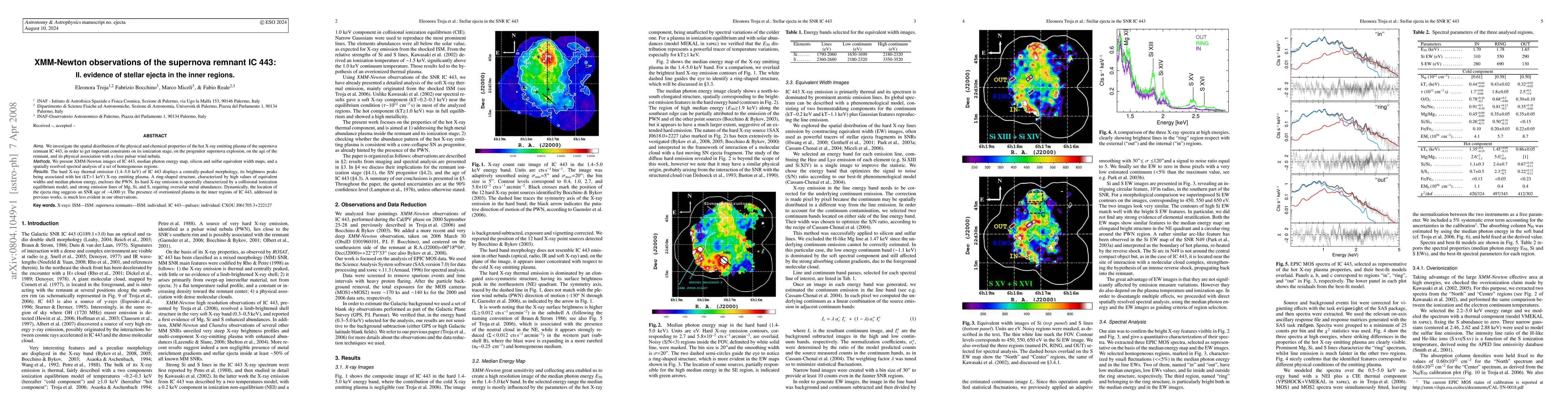 We investigate the spatial distribution of the physical and chemical properties of the hot X-ray emitting plasma of the supernova remnant IC 443, in order to get important constraints on its ionization stage, on the progenitor supernova explosion, on the age of the remnant, and its physical association with a close pulsar wind nebula. The hard X-ray thermal emission (1.4-5.0 keV) of IC 443 displays a centrally-peaked morphology, its brightness peaks being associated with hot (kT>1 keV) X-ray emitting plasma. A ring-shaped structure, characterized by high values of equivalent widths and median photon energy, encloses the PWN. Its hard X-ray emission is spectrally characterized by a collisional ionization equilibrium model, and strong emission lines of Mg, Si, and S, requiring oversolar metal abundances. Dynamically, the location of the ejecta ring suggests an SNR age of ~4,000 yr. The presence of overionized plasma in the inner regions of IC 443, addressed in previous works, is much less evident in our observations.