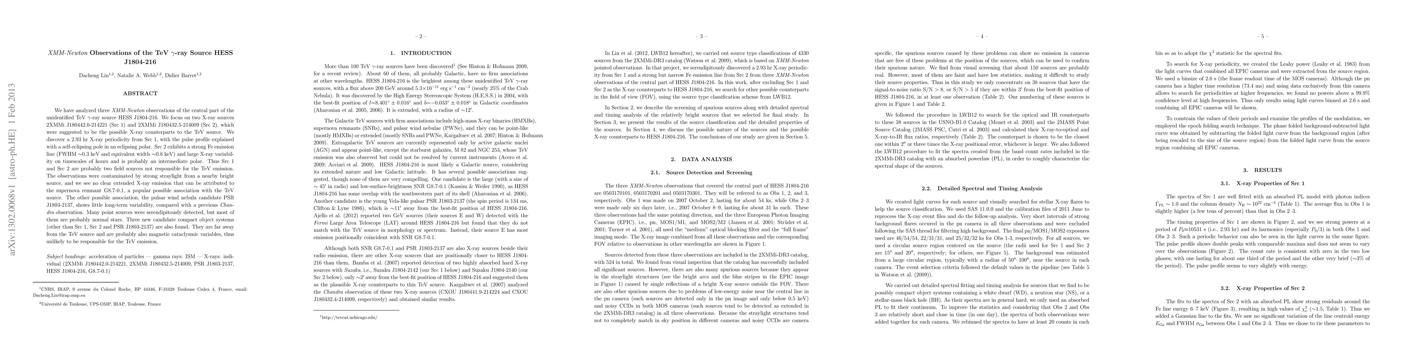 Astronomers used XMM-Newton to study HESS J1804-216, a mysterious TeV gamma-ray source, and found two possible X-ray counterparts that don't emit the same energy as the TeV source. The sources showed unusual properties, but were likely normal stars or other astrophysical phenomena.