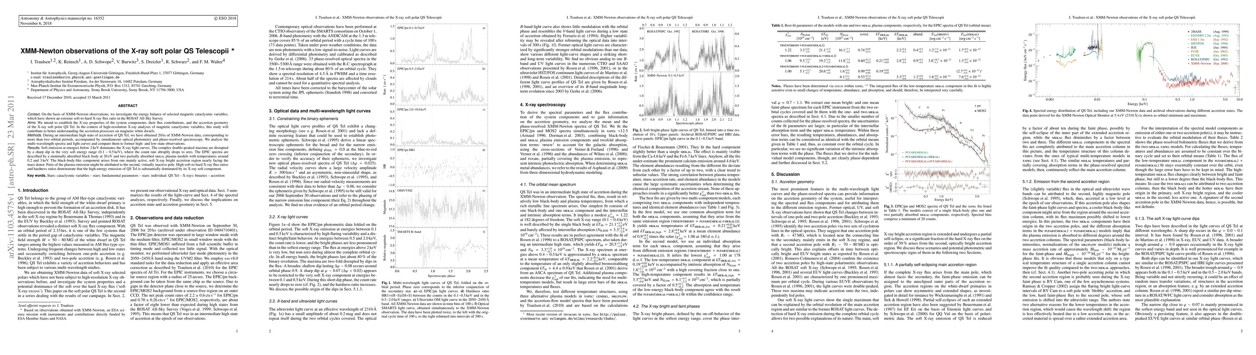 Context. On the basis of XMM-Newton observations, we investigate the energy balance of selected magnetic cataclysmic variables, which have shown an extreme soft-to-hard X-ray flux ratio in the ROSAT All-Sky Survey. Aims. We intend to establish the X-ray properties of the system components, their flux contributions, and the accretion geometry of the X-ray soft polar QS Tel. In the context of high-resolution X-ray analyses of magnetic cataclysmic variables, this study will contribute to better understanding the accretion processes on magnetic white dwarfs. Methods. During an intermediate high state of accretion of QS Tel, we have obtained 20 ks of XMM-Newton data, corresponding to more than two orbital periods, accompanied by simultaneous optical photometry and phase-resolved spectroscopy. We analyze the multi-wavelength spectra and light curves and compare them to former high- and low-state observations. Results. Soft emission at energies below 2 keV dominates the X-ray light curves. The complex double-peaked maxima are disrupted by a sharp dip in the very soft energy range (0.1-0.5 keV), where the count rate abruptly drops to zero. The EPIC spectra are described by a minimally absorbed black body at 20 eV and two partially absorbed MEKAL plasma models with temperatures around 0.2 and 3 keV. The black-body-like component arises from one mainly active, soft X-ray bright accretion region nearly facing the mass donor. Parts of the plasma emission might be attributed to the second, virtually inactive pole. High soft-to-hard X-ray flux ratios and hardness ratios demonstrate that the high-energy emission of QS Tel is substantially dominated by its X-ray soft component.