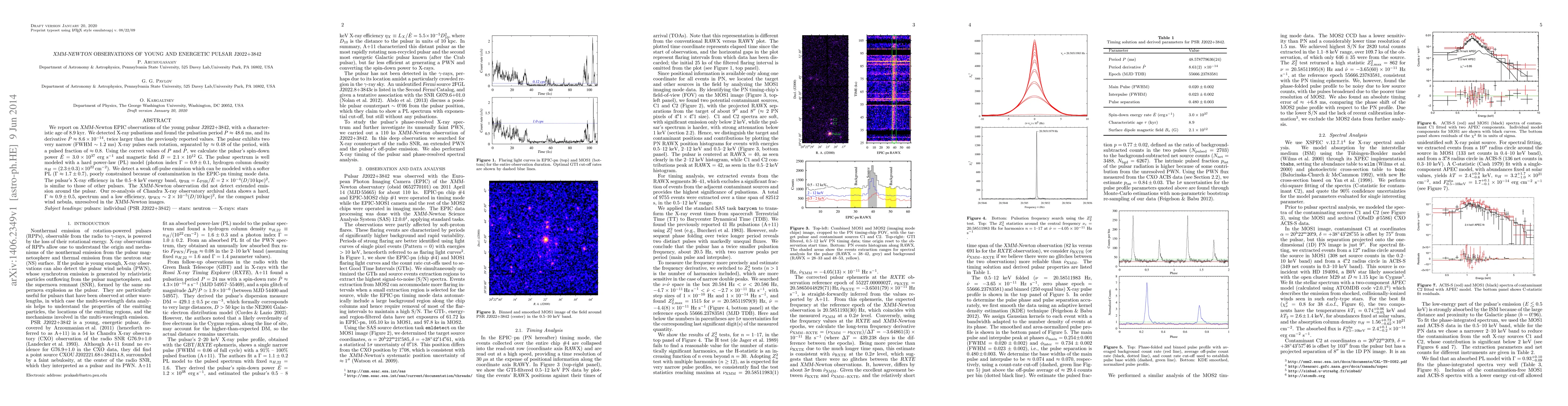 This paper reports on XMM-Newton observations of the young pulsar J2022+3842, revealing a pulsation period of 48.6 ms and a higher spin-down rate than previously reported. The pulsar exhibits two narrow X-ray pulses with a pulsed fraction of 0.8, and its spectrum is modeled with a hard power-law.