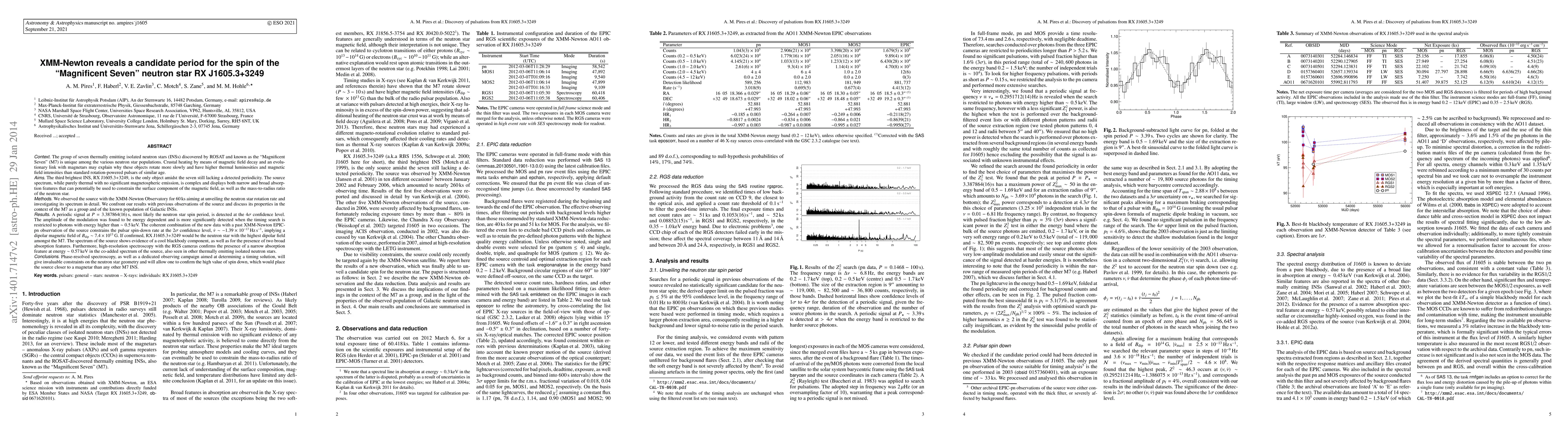 The group of thermally emitting isolated neutron stars (INSs) known as the "Magnificent Seven" (M7) is unique among the various neutron star populations. Crustal heating by means of magnetic field decay and an evolutionary link with magnetars may explain why these objects rotate more slowly and have higher thermal luminosities and magnetic field intensities than standard pulsars of similar age. The third brightest INS, RX J1605.3+3249, is the only object amidst the seven still lacking a detected periodicity. We observed the source with the XMM-Newton Observatory for 60 ks aiming at unveiling the neutron star rotation rate and investigating its spectrum in detail. A periodic signal at P=3.387864(16) s, most likely the neutron star spin period, is detected at the 4-sigma confidence level. The coherent combination of the new data with a past XMM-Newton EPIC-pn observation of the source constrains the pulsar spin-down rate at the 2-sigma confidence level, implying a dipolar magnetic field of B~7.4e13 G. If confirmed, RX J1605.3+3249 would be the neutron star with the highest dipolar field amongst the M7. The spectrum of the source shows evidence of a cool blackbody component, as well as for the presence of two broad absorption features. Furthermore, high-resolution spectroscopy with the RGS cameras confirms the presence of a narrow absorption feature at energy 0.57 keV in the co-added spectrum of the source, also seen in other thermally emitting isolated neutron stars. Phase-resolved spectroscopy, as well as a dedicated observing campaign aimed at determining a timing solution, will give invaluable constraints on the neutron star geometry and will allow one to confirm the high value of spin down, which would place the source closer to a magnetar than any other M7 INS.