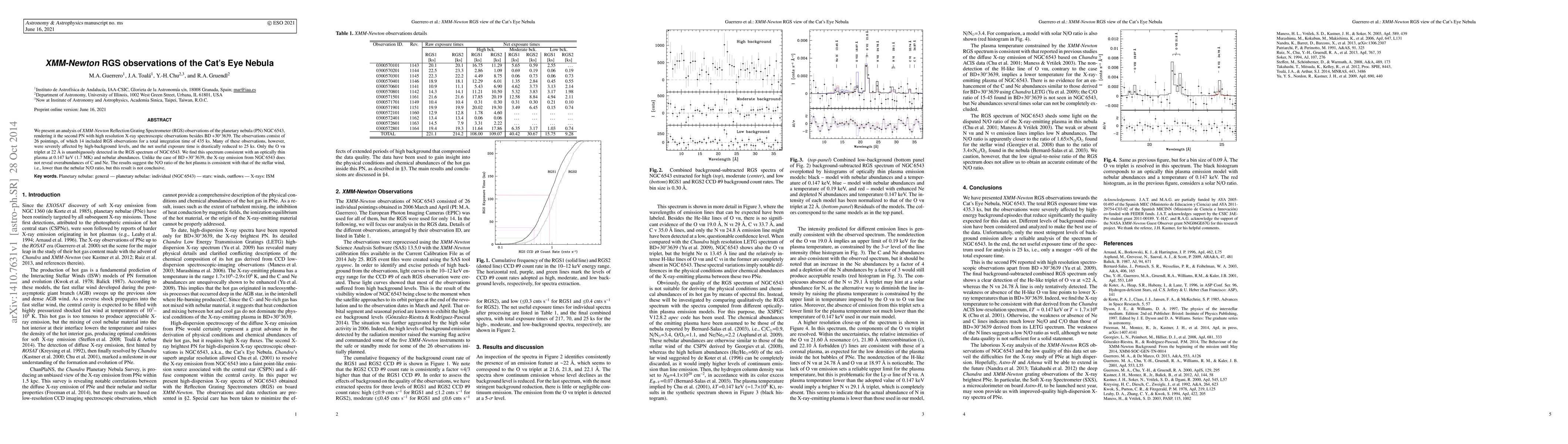 We present an analysis of XMM-Newton Reflection Grating Spectrometer (RGS) observations of the planetary nebula (PN) NGC 6543, rendering it the second PN with high resolution X-ray spectroscopic observations besides BD+30 3639. The observations consist of 26 pointings, of which 14 included RGS observations for a total integration time of 435 ks. Many of these observations, however, were severely affected by high-background levels, and the net useful exposure time is drastically reduced to 25 ks. Only the O VII triplet at 22 \AA\ is unambiguously detected in the RGS spectrum of NGC 6543. We find this spectrum consistent with an optically thin plasma at 0.147 keV (1.7 MK) and nebular abundances. Unlike the case of BD+30 3639, the X-ray emission from NGC 6543 does not reveal overabundances of C and Ne. The results suggest the N/O ratio of the hot plasma is consistent with that of the stellar wind, i.e., lower than the nebular N/O ratio, but this result is not conclusive.