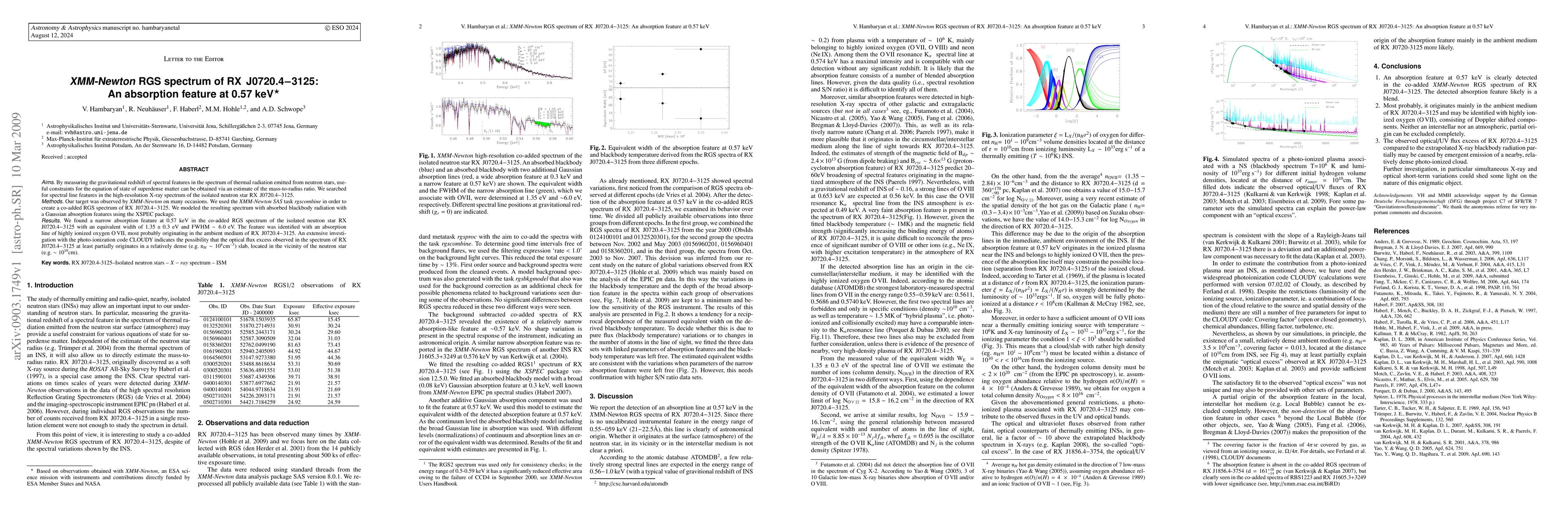 Researchers detected a narrow absorption feature at 0.57 keV in the XMM-Newton spectrum of RX J0720.4-3125, attributed to highly ionized oxygen OVII, which may originate from a dense slab near the neutron star.