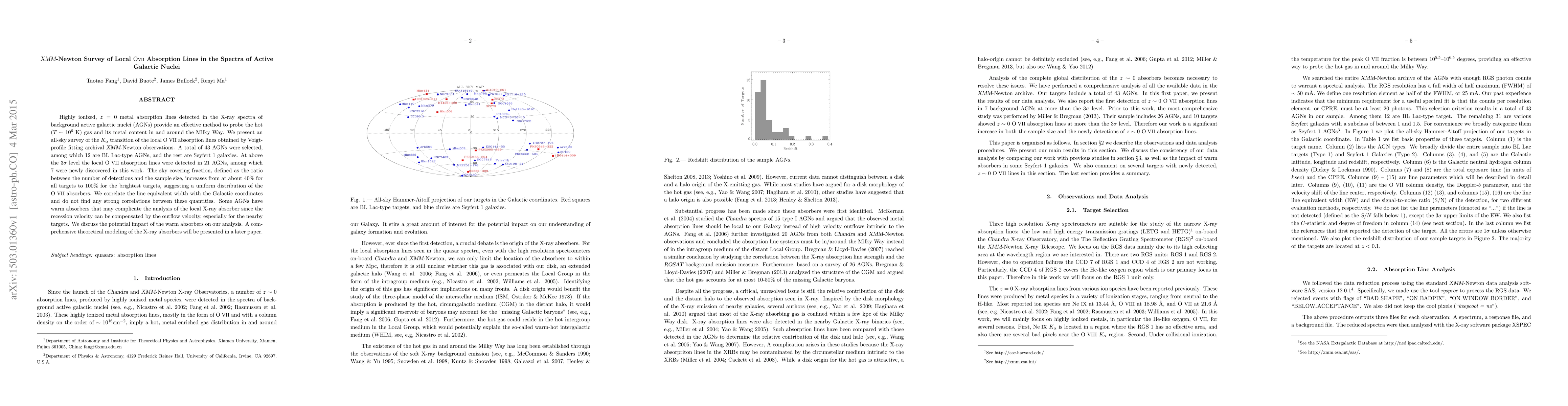 The research conducted an all-sky survey of the O VII Kα transition of local absorption lines in the spectra of 43 Active Galactic Nuclei (AGNs), using archival XMM-Newton observations. The study applied Voigt-profile fitting to detect the absorption lines, identifying 21 detections, including 7 new discoveries.
