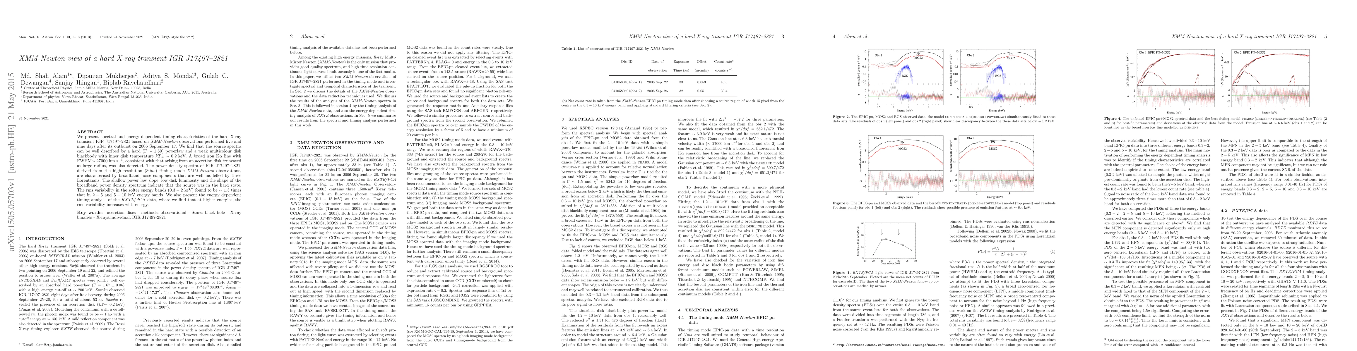 The XMM-Newton observations of the hard X-ray transient IGR J17497-2821 reveal spectra characterized by a hard powerlaw and a weak disk blackbody, with a broad iron K-alpha line suggesting a truncated accretion disk. The source's broadband power density spectrum is well-modeled by three Lorentzians, indicating it was in the hard state during the observations.