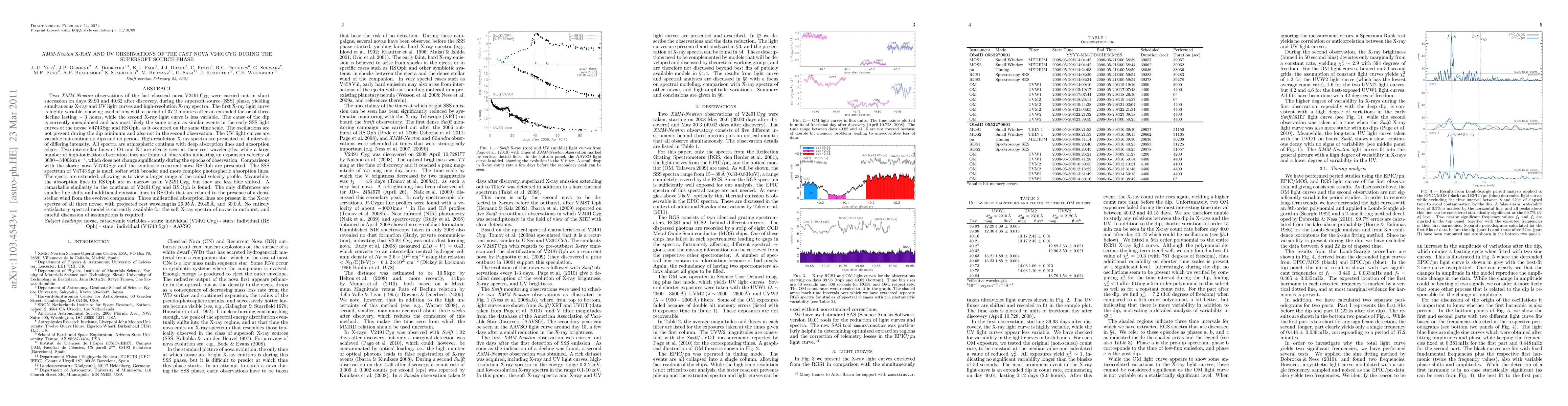 The XMM-Newton observations of the fast nova V2491 Cyg during its supersoft source phase revealed highly variable X-ray light curves with periodic oscillations and dips, unexplained and occurring on similar time scales as in other novae. Simultaneous UV light curves showed variability without dips or periods. High-resolution X-ray spectra indicated high-ionization lines with blue shifts of 3000-3400 km/s, consistent across observations. Comparisons with slower nova V4743Sgr and recurrent nova RSOph showed differences in spectral features, suggesting distinct physical conditions. Three unidentified absorption lines were found in all three novae' spectra.