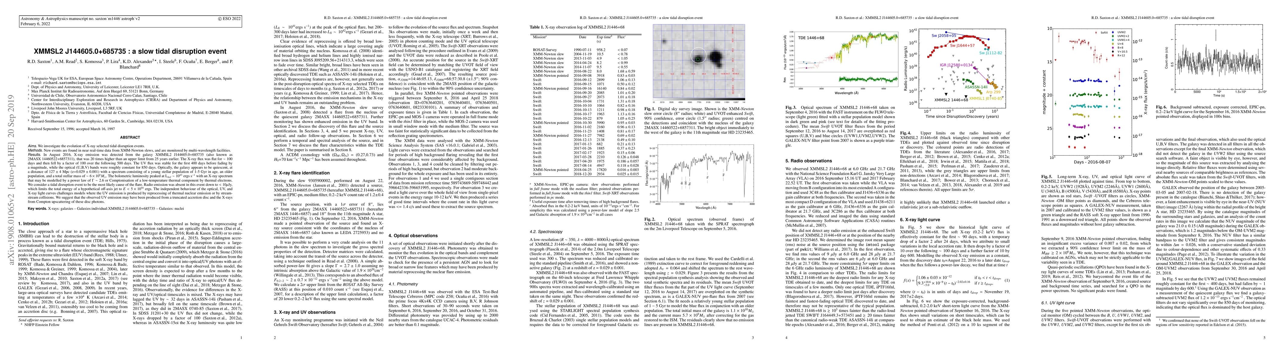 This paper investigates a slow tidal disruption event in the galaxy XMMSL2 J144605.0+685735, detected via a sudden increase in X-ray emission in 2016. The X-ray flux peaked and then declined significantly over 500 days, while the UV flux remained stable before fading, and the optical remained constant. The event suggests a truncated accretion disk for UV emission and Compton upscattering for X-rays, with no radio emission indicating a low-energy jet.