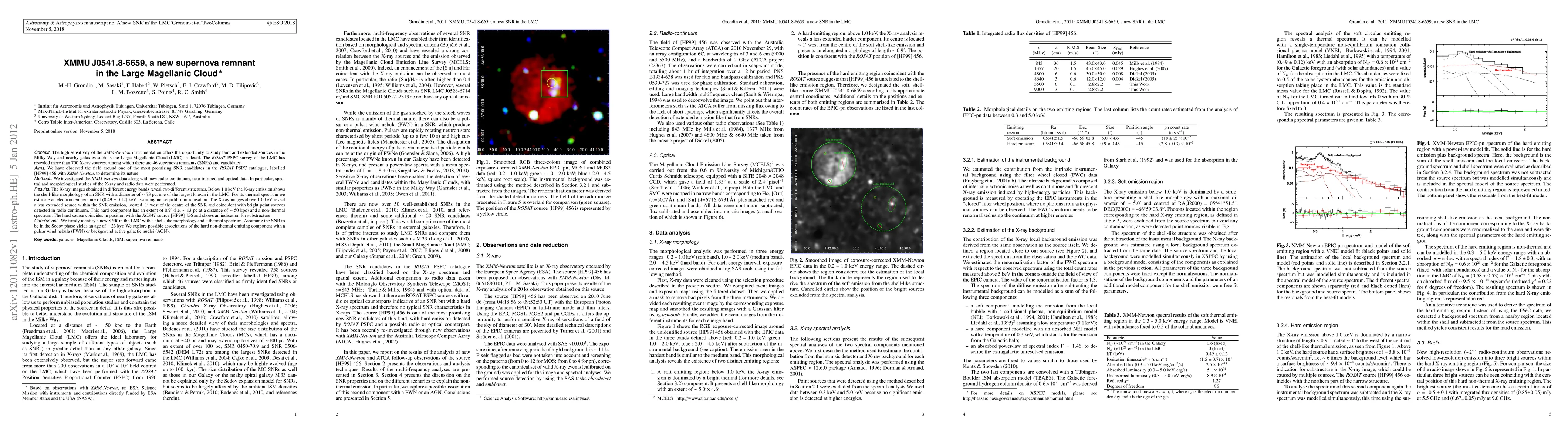 The high sensitivity of the XMM-Newton instrumentation offers the opportunity to study faint and extended sources in the Milky Way and nearby galaxies such as the Large Magellanic Cloud (LMC) in detail. The ROSAT PSPC survey of the LMC has revealed more than 700 X-ray sources, among which there are 46 supernova remnants (SNRs) and candidates. We have observed the field around one of the most promising SNR candidates in the ROSAT PSPC catalogue, labelled [HP99] 456 with XMM-Newton, to determine its nature. We investigated the XMM-Newton data along with new radio-continuum, near infrared and optical data. In particular, spectral and morphological studies of the X-ray and radio data were performed. The X-ray images obtained in different energy bands reveal two different structures. Below 1.0 keV the X-ray emission shows the shell-like morphology of an SNR with a diameter of ~73 pc, one of the largest known in the LMC. For its thermal spectrum we estimate an electron temperature of (0.49 +/- 0.12)keV assuming non-equilibrium ionisation. The X-ray images above 1.0 keV reveal a less extended source within the SNR emission, located ~1' west of the centre of the SNR and coincident with bright point sources detected in radio-continuum. This hard component has an extent of 0.9' (i.e. ~13 pc at a distance of ~50 kpc) and a non-thermal spectrum. The hard source coincides in position with the ROSAT source [HP99] 456 and shows an indication for substructure. We firmly identify a new SNR in the LMC with a shell-like morphology and a thermal spectrum. Assuming the SNR to be in the Sedov phase yields an age of ~23 kyr. We explore possible associations of the hard non-thermal emitting component with a pulsar wind nebula (PWN) or background active galactic nuclei (AGN).