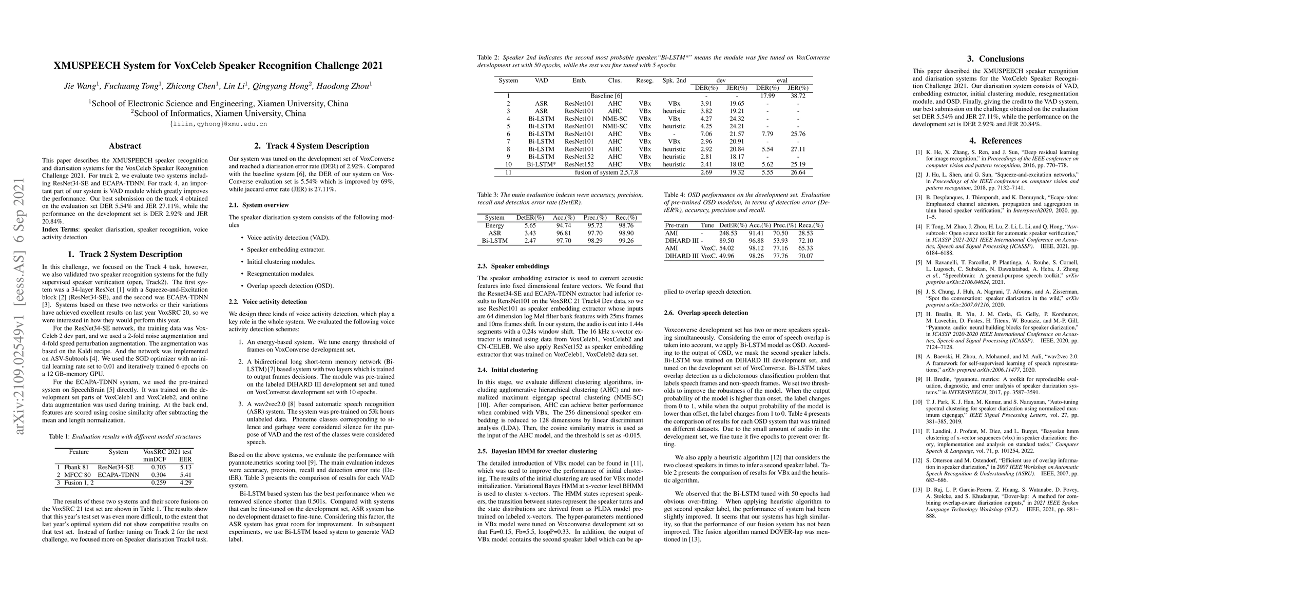 This paper describes the XMUSPEECH speaker recognition and diarisation systems for the VoxCeleb Speaker Recognition Challenge 2021. For track 2, we evaluate two systems including ResNet34-SE and ECAPA-TDNN. For track 4, an important part of our system is VAD module which greatly improves the performance. Our best submission on the track 4 obtained on the evaluation set DER 5.54% and JER 27.11%, while the performance on the development set is DER 2.92% and JER 20.84%.