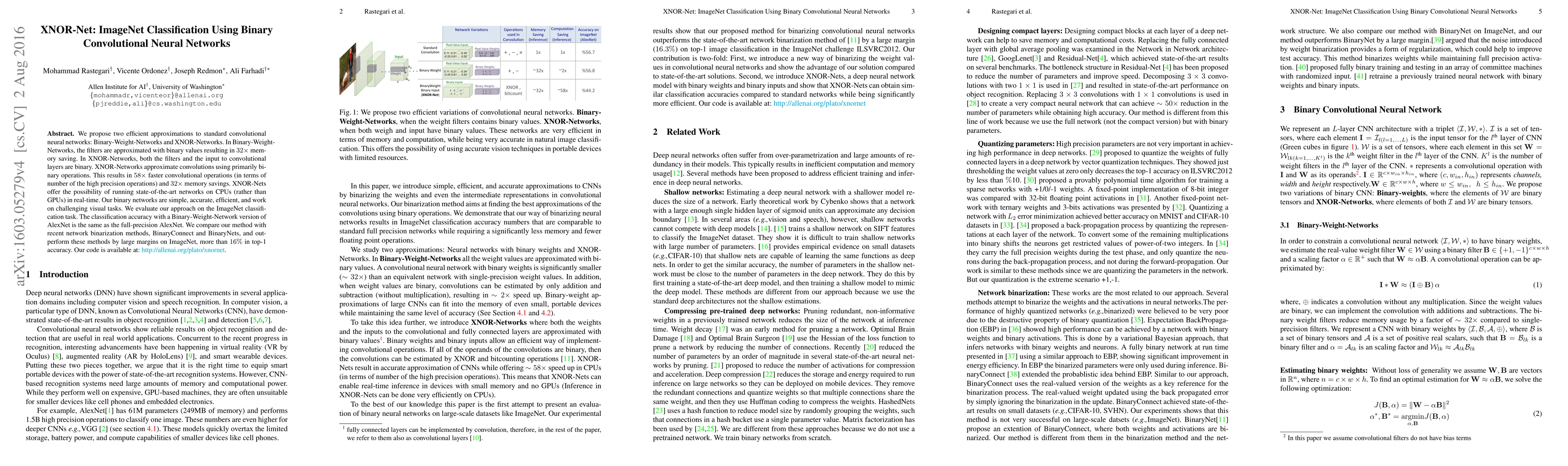 XNOR-Net proposes binary convolutional neural networks that drastically reduce memory usage and speed up convolutional operations, achieving near-full-precision accuracy on ImageNet classification while outperforming other binarization methods.