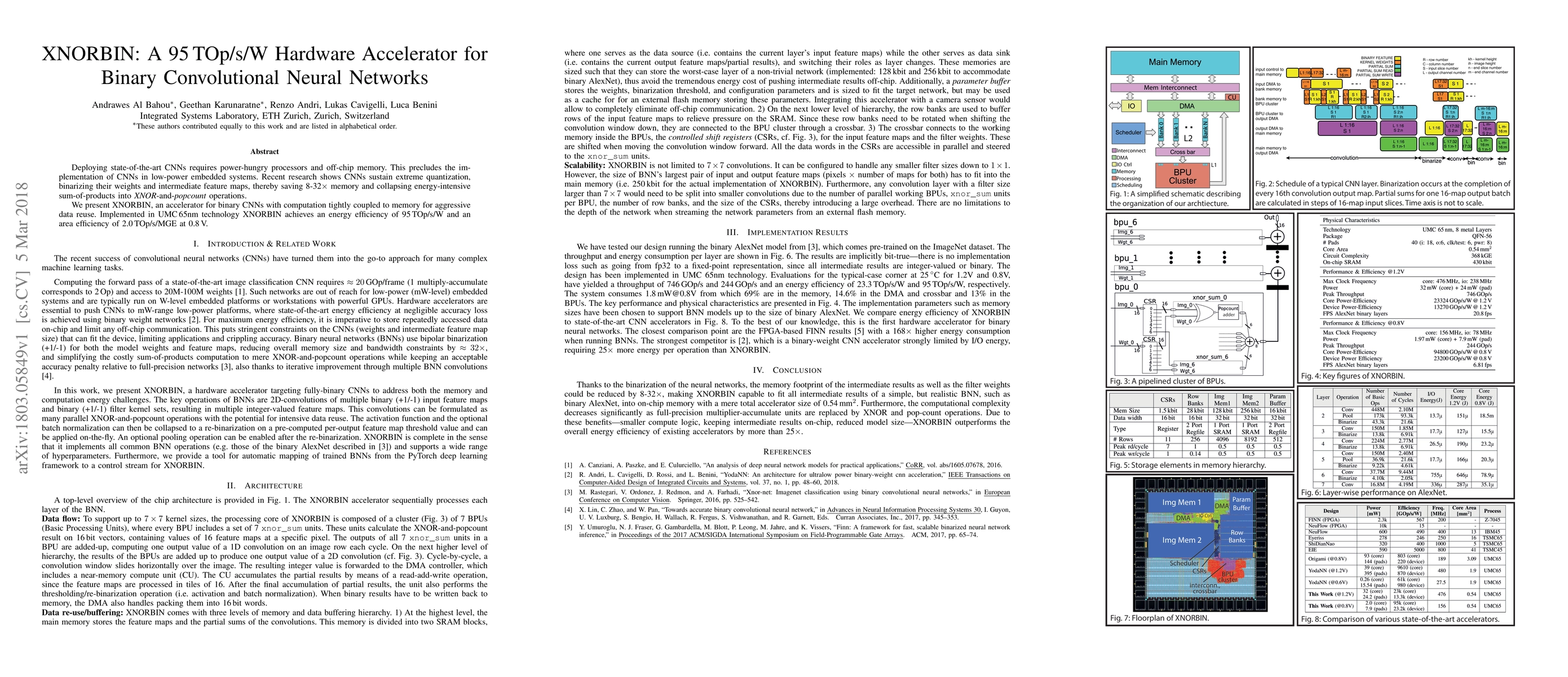 Deploying state-of-the-art CNNs requires power-hungry processors and off-chip memory. This precludes the implementation of CNNs in low-power embedded systems. Recent research shows CNNs sustain extreme quantization, binarizing their weights and intermediate feature maps, thereby saving 8-32\x memory and collapsing energy-intensive sum-of-products into XNOR-and-popcount operations. We present XNORBIN, an accelerator for binary CNNs with computation tightly coupled to memory for aggressive data reuse. Implemented in UMC 65nm technology XNORBIN achieves an energy efficiency of 95 TOp/s/W and an area efficiency of 2.0 TOp/s/MGE at 0.8 V.