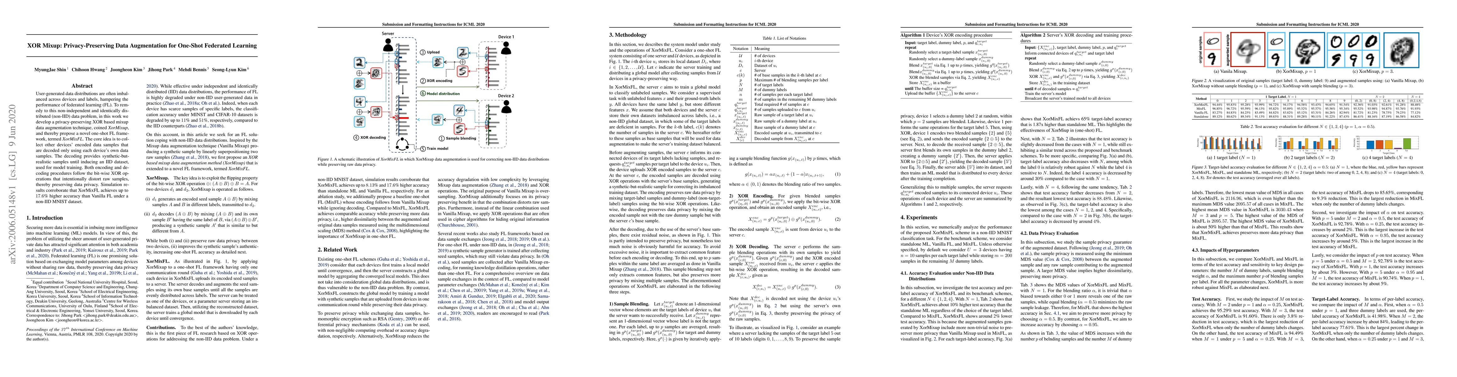 User-generated data distributions are often imbalanced across devices and labels, hampering the performance of federated learning (FL). To remedy to this non-independent and identically distributed (non-IID) data problem, in this work we develop a privacy-preserving XOR based mixup data augmentation technique, coined XorMixup, and thereby propose a novel one-shot FL framework, termed XorMixFL. The core idea is to collect other devices' encoded data samples that are decoded only using each device's own data samples. The decoding provides synthetic-but-realistic samples until inducing an IID dataset, used for model training. Both encoding and decoding procedures follow the bit-wise XOR operations that intentionally distort raw samples, thereby preserving data privacy. Simulation results corroborate that XorMixFL achieves up to 17.6% higher accuracy than Vanilla FL under a non-IID MNIST dataset.